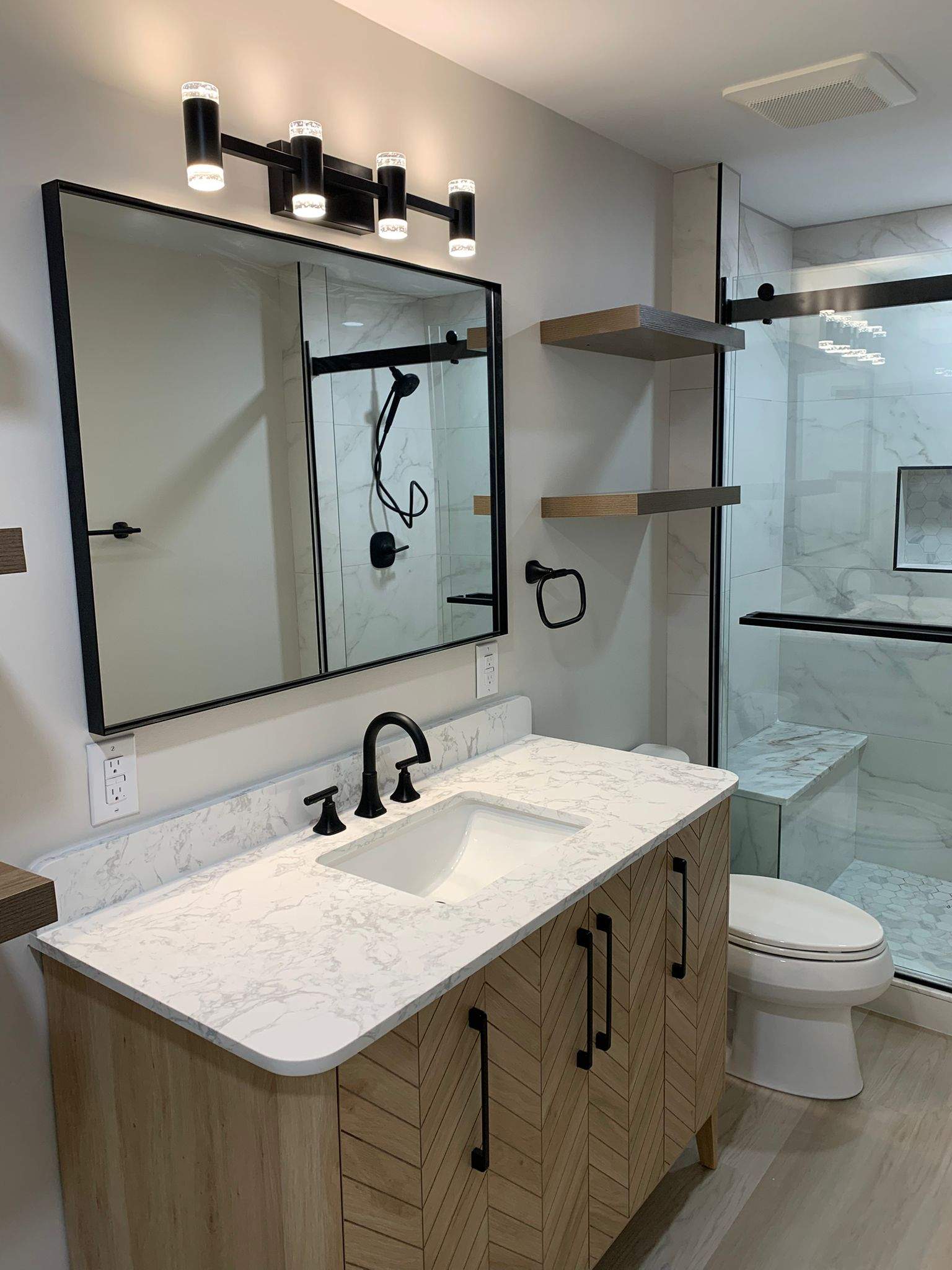 Modern Spa-Style Bathroom Renovation. This bathroom renovation delivers a clean, modern spa-inspired design with a strong balance of warmth, contrast, and functionality. A custom glass-enclosed shower serves as the focal point, featuring large-format marble-look wall tile, a hex mosaic shower floor, and a built-in niche for streamlined storage. Matte black shower fixtures and hardware add bold contrast while maintaining a sleek, contemporary feel. The vanity area is anchored by a wood-toned cabinet with a distinctive herringbone-style door design, paired with a quartz countertop and undermount sink for durability and elegance. Matte black faucets, hardware, and accessories tie the space together, while floating wood shelves add both visual interest and practical storage. Modern lighting above the mirror enhances brightness and elevates the overall aesthetic. Light-toned flooring softens the space and complements the neutral palette, creating a bright, open feel throughout. This project highlights thoughtful design choices, high-quality materials, and precise craftsmanship—resulting in a refined, spa-like bathroom built for everyday comfort and long-term performance.