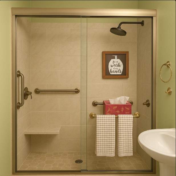 Accessible Walk-In Shower Renovation with Warm, Timeless Style. This bathroom renovation focuses on safety, accessibility, and classic design, transforming the space into a comfortable and user-friendly retreat. The walk-in shower features a low-profile entry, built-in bench, and integrated grab bars for added stability, all seamlessly incorporated into the design. Neutral-toned wall tile and coordinating floor tile create a calm, cohesive look, while the frameless glass enclosure keeps the space feeling open and bright. Thoughtful details such as a recessed shower niche, rainfall showerhead, and matching hardware enhance both function and style. The finished space delivers a perfect balance of practicality and warmth, offering a safe, elegant shower solution designed for long-term comfort and ease of use.