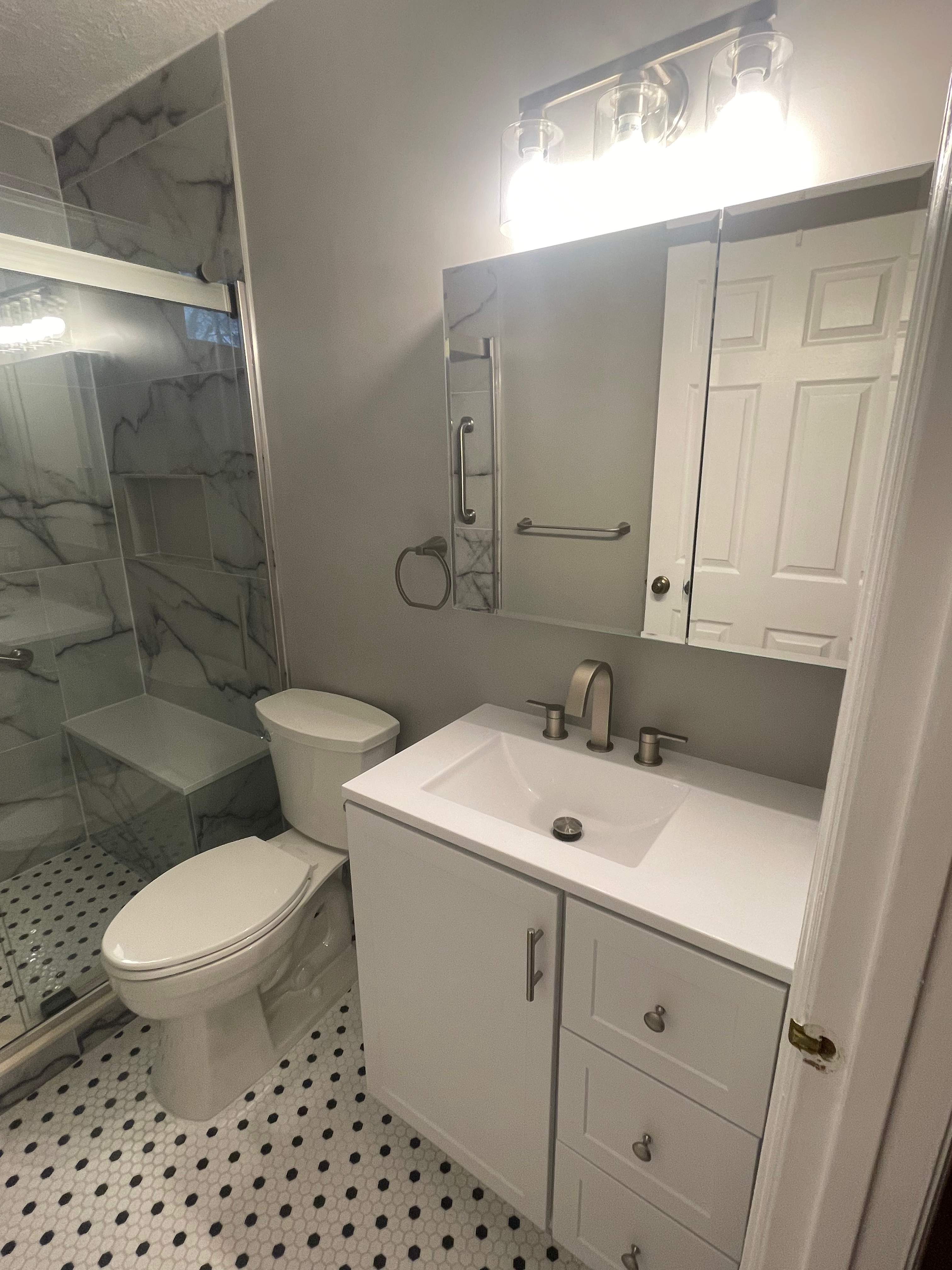 Timeless Marble-Inspired Bathroom Renovation with Classic Hex Tile. This bathroom renovation blends timeless design with modern functionality to create a clean, elegant space. Large-format marble-look wall tile adds depth and sophistication to the shower, paired with a sleek glass enclosure and built-in bench for comfort and accessibility. A classic hex mosaic floor with contrasting dot accents brings visual interest while maintaining a traditional feel. The space is completed with a crisp white vanity, quartz countertop, brushed hardware, and updated lighting that brightens the room and enhances everyday use. Thoughtful details and durable finishes come together in this renovation to deliver a bathroom that feels both refined and practical.