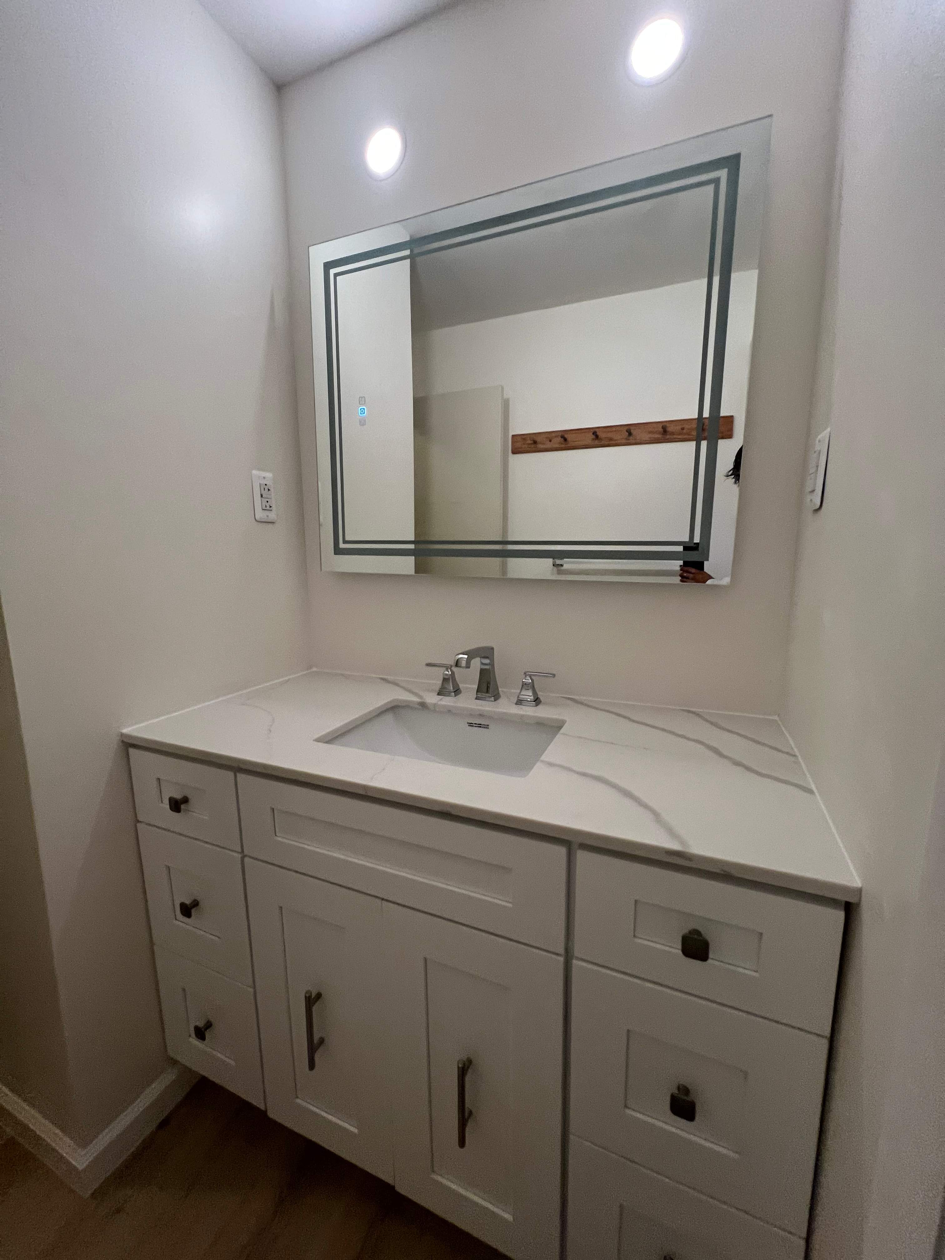 Bright & Timeless Bathroom Vanity Upgrade. This bathroom refresh centers around a clean, modern vanity design that elevates both style and functionality. A crisp white shaker-style vanity provides generous storage while maintaining a streamlined appearance. The quartz countertop features subtle veining that adds visual interest without overpowering the space, paired with an integrated rectangular sink for a seamless finish. An illuminated mirror enhances the room with soft, even lighting, improving daily usability while adding a contemporary touch. Recessed ceiling lights further brighten the space, creating an open and inviting feel. Neutral wall tones and warm flooring complete the design, resulting in a polished bathroom update that feels fresh, timeless, and highly functional.
