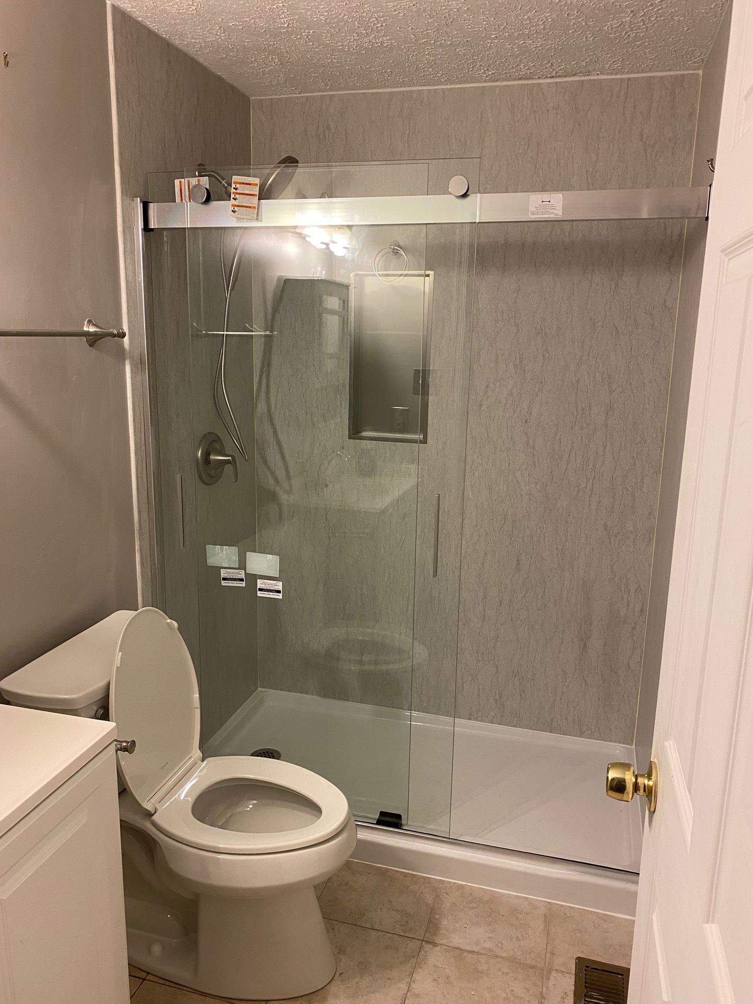 Modern Low-Maintenance Bathroom Refresh. This bathroom renovation delivers a clean, contemporary update focused on durability, comfort, and ease of maintenance. The existing tub was replaced with a sleek walk-in shower featuring solid surface wall panels, a low-profile shower base, and a sliding glass enclosure that maximizes space and light. A built-in recessed niche provides convenient storage while keeping the shower walls uncluttered. Neutral tones throughout the space create a bright, timeless feel, complemented by updated fixtures and hardware in a modern finish. The vanity area was refreshed to improve functionality and visual balance, while new lighting enhances clarity and warmth. Overall, this project transforms the bathroom into a modern, efficient, and low-maintenance space designed for everyday comfort.