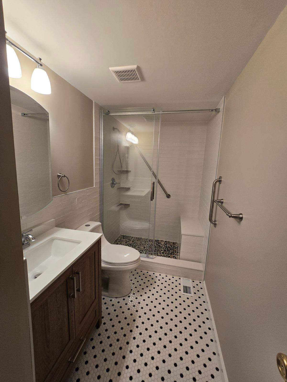 Classic Meets Contemporary Bathroom Renovation. This bathroom renovation balances timeless design with modern upgrades to create a clean, functional, and welcoming space. A warm wood vanity paired with a crisp white countertop anchors the room, offering ample storage while adding natural contrast. The sleek mirror and updated lighting brighten the space and enhance everyday usability. The walk-in shower features bright, subway-style wall tile, built-in shelving for convenience, and a pebble-stone shower floor that adds texture and visual interest. A frameless glass enclosure keeps the layout open while allowing light to flow throughout the room. Classic black-and-white patterned floor tile ties the design together, delivering a fresh look that feels both elegant and enduring. The completed remodel highlights thoughtful material choices, improved functionality, and a timeless aesthetic designed to stand the test of time.