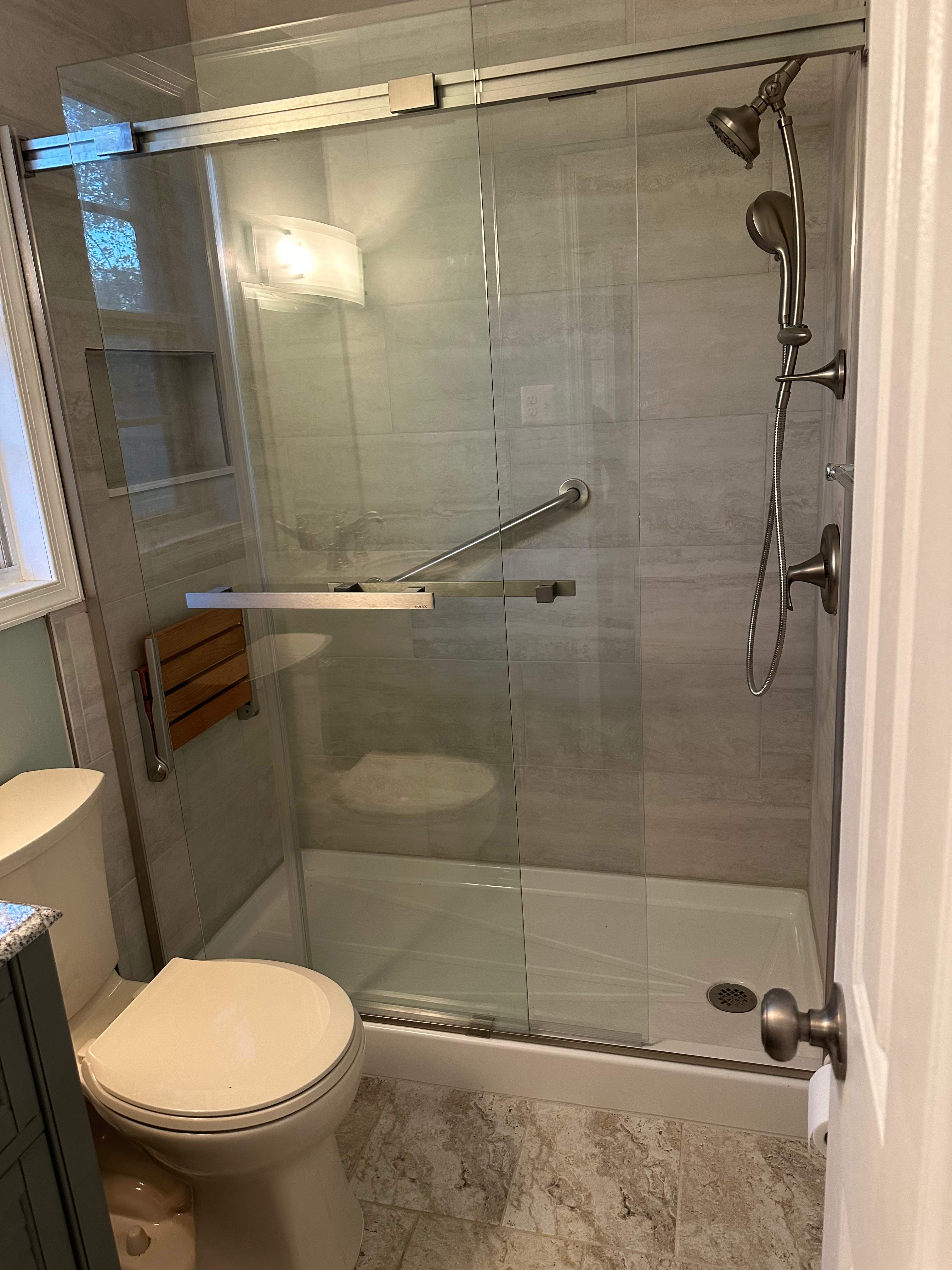 Modern, Accessible Bathroom Remodel with Frameless Glass Shower. This bathroom remodel delivers a clean, modern upgrade with a strong focus on comfort, accessibility, and timeless style. The centerpiece is a sleek walk-in shower featuring large-format, stone-look tile, a frameless sliding glass enclosure, and a built-in niche for streamlined storage. A pebble-style shower floor adds texture and visual interest while enhancing slip resistance. Thoughtful details elevate functionality, including an integrated grab bar, a fold-down teak shower seat, and a handheld shower system for added convenience. Neutral tones throughout the space create a calm, spa-like atmosphere, complemented by durable flooring and updated fixtures that balance practicality with contemporary design. The result is a bright, refined bathroom that combines safety, ease of use, and modern elegance.