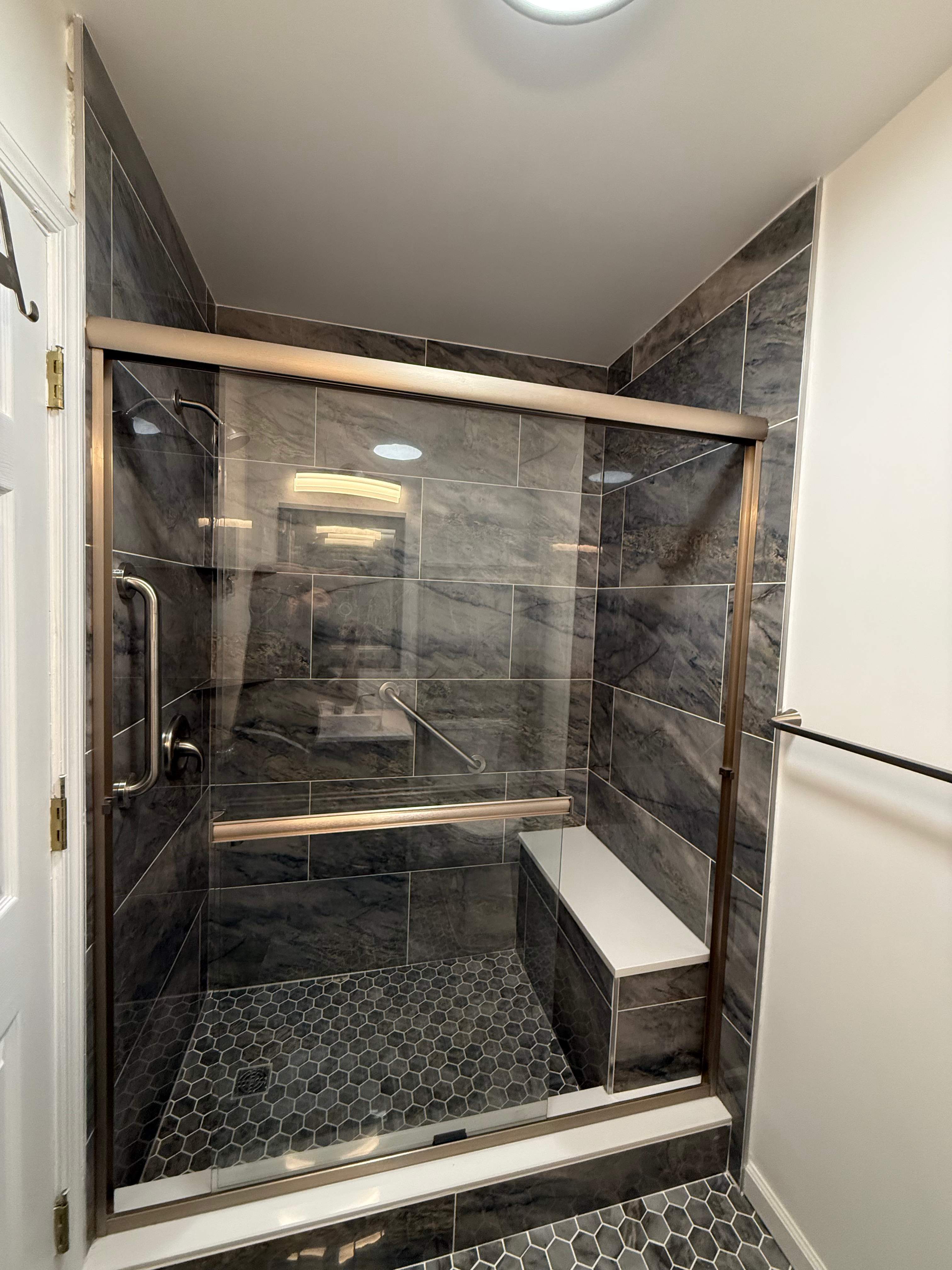 Modern Spa-Inspired Bathroom Renovation with Accessible Design. This bathroom renovation blends modern style with thoughtful functionality, creating a clean, spa-like retreat designed for everyday comfort. The custom walk-in shower features large-format stone-look tile, a hexagon mosaic floor, built-in bench, and grab bars for added accessibility without sacrificing aesthetics. A sleek glass enclosure keeps the space open and bright. The vanity area was updated with a contemporary cabinet, solid-surface countertop, brushed nickel fixtures, and modern lighting to enhance both style and usability. Neutral wall tones and coordinated finishes tie the space together, while durable flooring ensures long-lasting performance. The result is a refreshed bathroom that balances elegance, safety, and practicality in a timeless design.