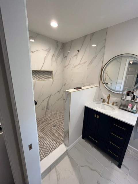Modern Spa-Inspired Bathroom Renovation with Elegant Tile Details. This bathroom renovation showcases a seamless blend of modern design and timeless elegance across every detail. The walk-in shower serves as a striking focal point, featuring large-format marble-look porcelain tile that creates a bright, open, and luxurious feel. A hexagon mosaic tile floor adds texture and visual interest, while a built-in bench and recessed niche provide comfort and functional storage, finished with clean, refined trim accents. The vanity area complements the shower with a bold, dark-toned vanity paired with brass hardware, a crisp white countertop, and a round mirror that softens the space. Coordinated flooring, warm lighting, and thoughtful finishes tie the room together, resulting in a cohesive, spa-like bathroom designed for both everyday use and long-lasting style.