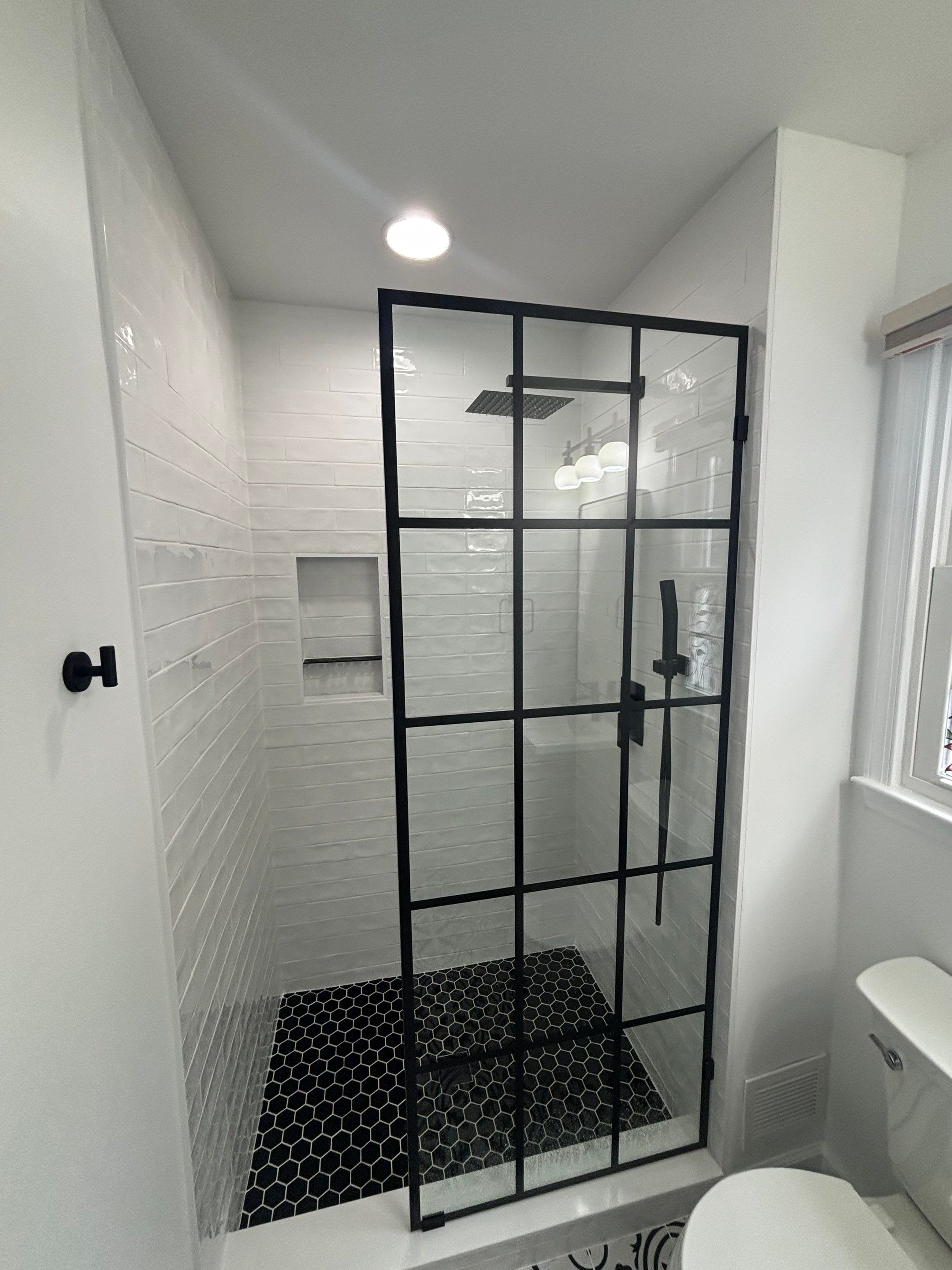 Modern Eclectic Bathroom Renovation with Bold Contrast and Clean Lines. This bathroom renovation showcases a thoughtful blend of modern, industrial, and eclectic design elements to create a space that feels both fresh and inviting. The highlight of the project is the striking black-framed shower enclosure, which brings architectural interest and a contemporary edge. Inside the shower, glossy white subway tiles and black hexagonal floor tiles offer a timeless yet dramatic contrast. The room’s patterned encaustic-style floor tile adds personality and visual rhythm, grounding the space with a bold, artistic touch. A warm wood vanity introduces natural texture and balance, complemented by sleek matte-black fixtures that unify the overall palette. Thoughtful details—such as the recessed shower niche, minimalist lighting, and decorative privacy film on the window—enhance both function and style. This renovation transforms a standard bathroom into a thoughtfully curated retreat, combining modern sophistication with playful character and everyday practicality.