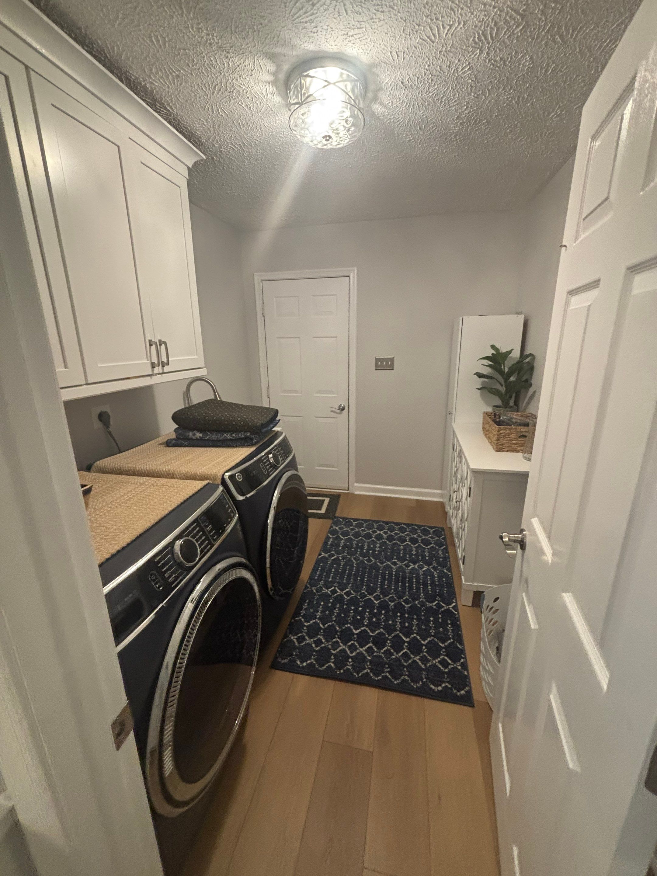 Modern Kitchen & Laundry Room Transformation. This home renovation project focuses on creating bright, functional, and beautifully cohesive spaces tailored for modern living. Each room was thoughtfully redesigned to balance style with practical everyday use. The kitchen features a clean, contemporary aesthetic with warm finishes and efficient storage, offering an inviting environment for cooking and gathering. The updated laundry room brings added organization and convenience, combining sleek appliances with custom cabinetry and durable surfaces. Throughout the home, coordinated materials, soft color palettes, and refined design details create a unified look that enhances comfort, flow, and overall livability. This project delivers a fresh, polished transformation while maintaining a warm, welcoming atmosphere for the homeowner.