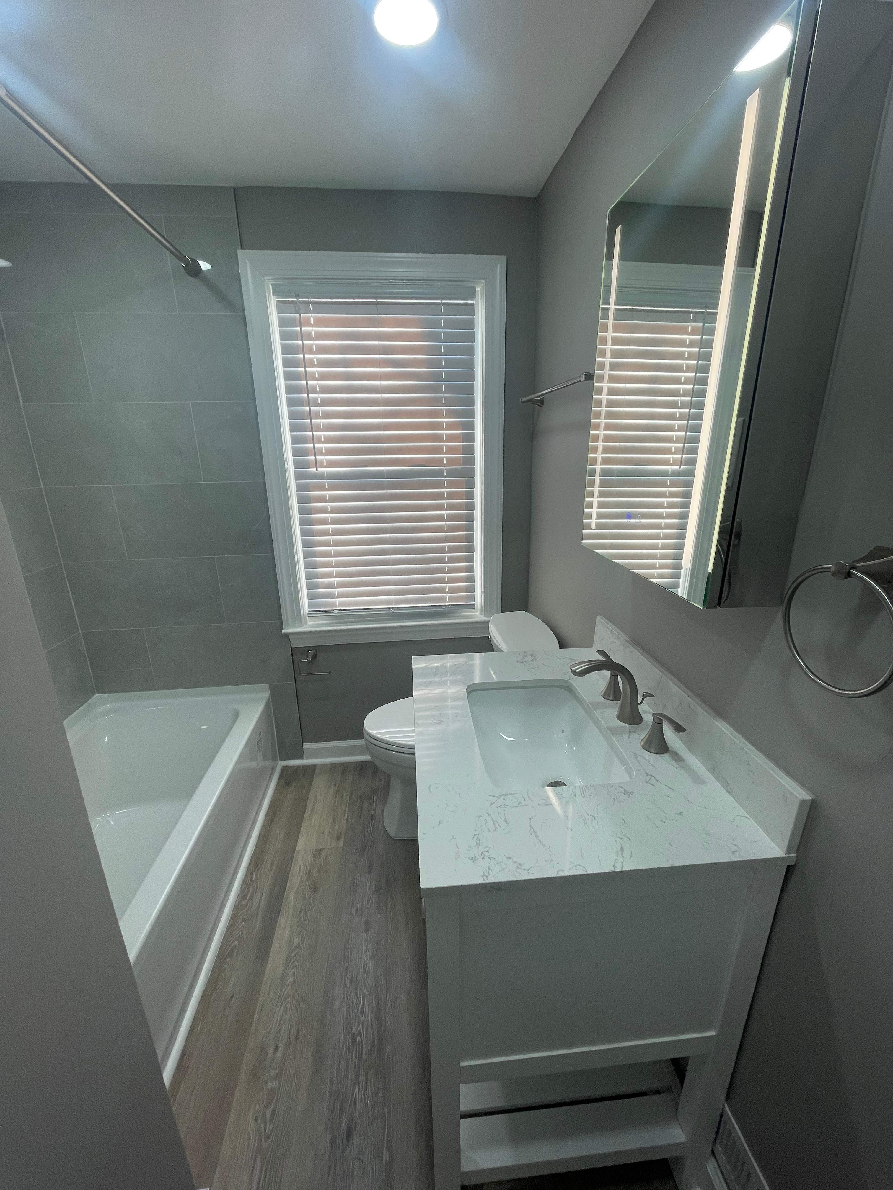Modern Gray Bathroom Refresh with Clean Lines. This single-bathroom renovation delivers a fresh, modern look with a calm, cohesive palette and thoughtful upgrades throughout. Large-format gray wall tile creates a sleek, spa-like tub surround, paired with a crisp white tub for a clean, timeless contrast. A contemporary vanity with a quartz countertop adds both style and functionality, offering durable surfaces and streamlined storage. Wood-look flooring brings warmth and balance to the space while maintaining water resistance and easy maintenance. Updated fixtures, a lighted mirror, and soft neutral wall tones complete the design, enhancing brightness and visual flow. The result is a modern, low-maintenance bathroom that feels open, refined, and perfectly suited for everyday living.