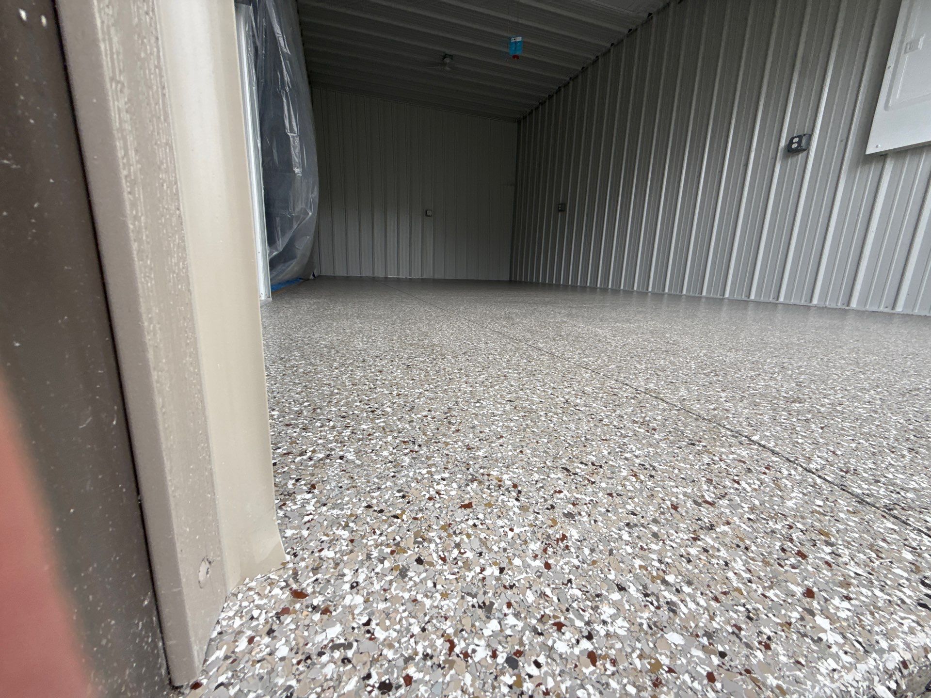 Polyaspartic, Pebble Beach Flakes, Pole Barn Concrete Coating
