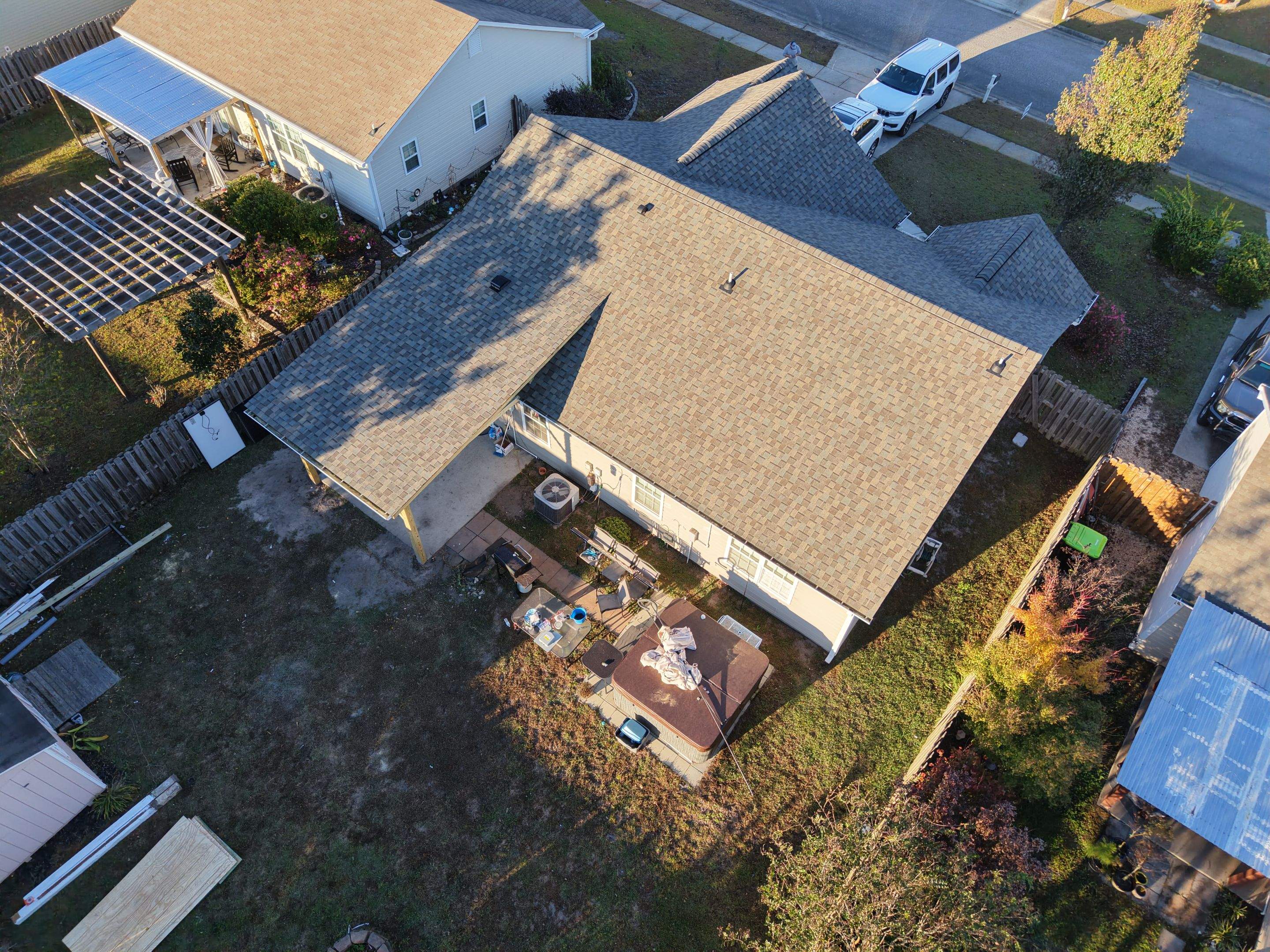 is project in Leland, NC (28451) included a FORTIFIED Roof™ replacement, a custom covered porch build, and coordination with existing solar panels to ensure a seamless, code-compliant installation. Our team carefully removed the existing roofing system, completed structural upgrades, and installed CertainTeed Landmark Pro Max Def shingles in Weathered Wood, following FORTIFIED standards for improved wind resistance and long-term roof performance. Because the home features solar panels, special attention was given to flashing, roof penetrations, and panel integration to protect the roof deck and maintain system integrity. The new covered porch was framed and tied into the structure to enhance outdoor living space while meeting local building requirements. Completed by RGR Construction & Roofing, LLC, this project highlights our ability to handle complex roof replacements, solar-integrated roofing systems, and exterior construction for homeowners in Leland and throughout Brunswick County.