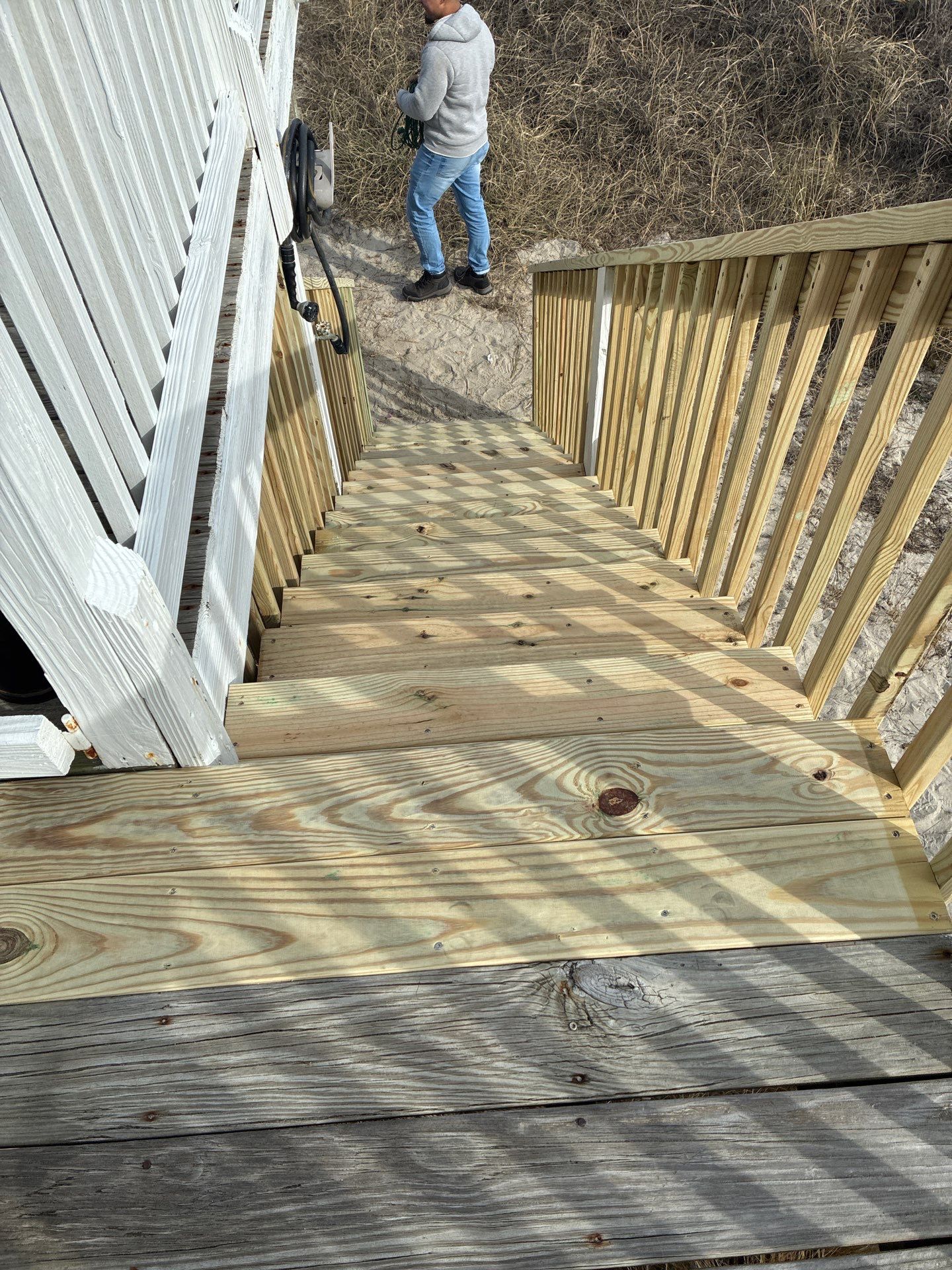 Complete exterior step rebuild and handrail installation in Oak Island, NC. This project included removal of deteriorated stairs and reconstruction using pressure-treated lumber designed to withstand coastal moisture, salt air, and heavy foot traffic. The new stair system was built for structural integrity, proper rise/run measurements, and improved safety. A secure, code-compliant handrail was installed to enhance accessibility and durability while maintaining a clean coastal aesthetic. RGR Construction and Roofing, LLC provides professional deck repairs, stair rebuilds, and exterior carpentry throughout Oak Island and Brunswick County — delivering strong, safe, and storm-ready construction built for coastal North Carolina conditions.
