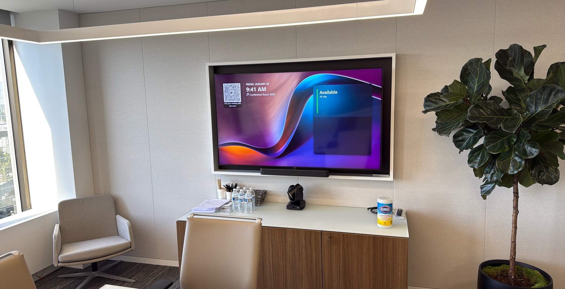 Modern Conference Room AV Upgrade – Los Angeles, CA We delivered a premium, PC-based video conferencing solution for a high-performance meeting space, featuring seamless integration of Logitech and Shure technologies for crystal-clear 4K video and superior audio coverage. Logitech Rally 4K PTZ Camera: Captures ultra-HD video with mechanical pan/tilt/zoom, RightSense™ automation, and wide field of view for natural, inclusive framing of participants. Logitech Tap Touch Controller: Intuitive 10.1" interface for one-touch joining of Microsoft Teams, Zoom Rooms, or other platforms, mounted for effortless room control. Logitech Tap Scheduler: Wall-mounted panel for easy room booking, availability viewing, and ad-hoc reservations—keeping schedules organized and spaces utilized efficiently. Shure IP Ceiling Microphone & Speakers: Discreet in-ceiling array microphone (e.g., MXA910-style coverage) paired with networked ceiling speakers for even, echo-free audio pickup and reproduction across the room—ideal for larger or acoustically challenging spaces. This flexible, PC-driven setup ensures reliable hybrid collaboration with professional-grade visuals and immersive sound, tailored for executive and team environments in the heart of Los Angeles.