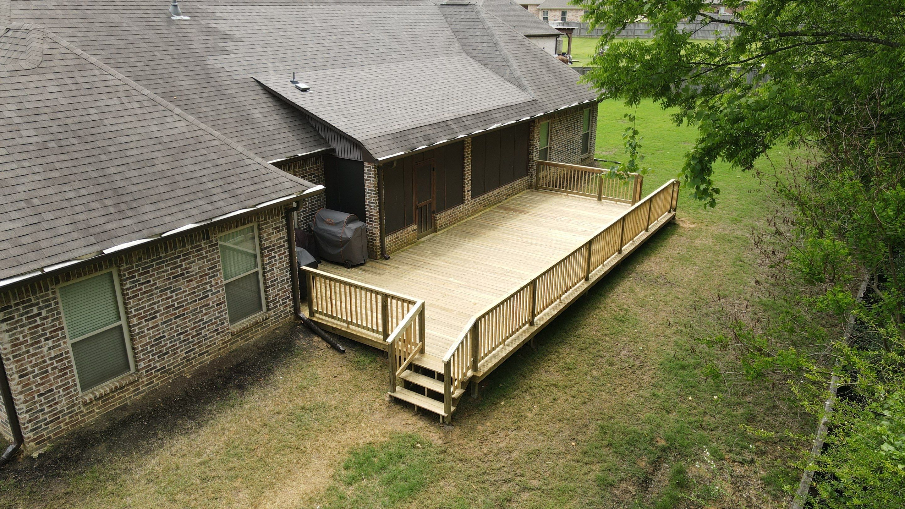 Treated pine deck with handrail, steps, and posts set in concrete
