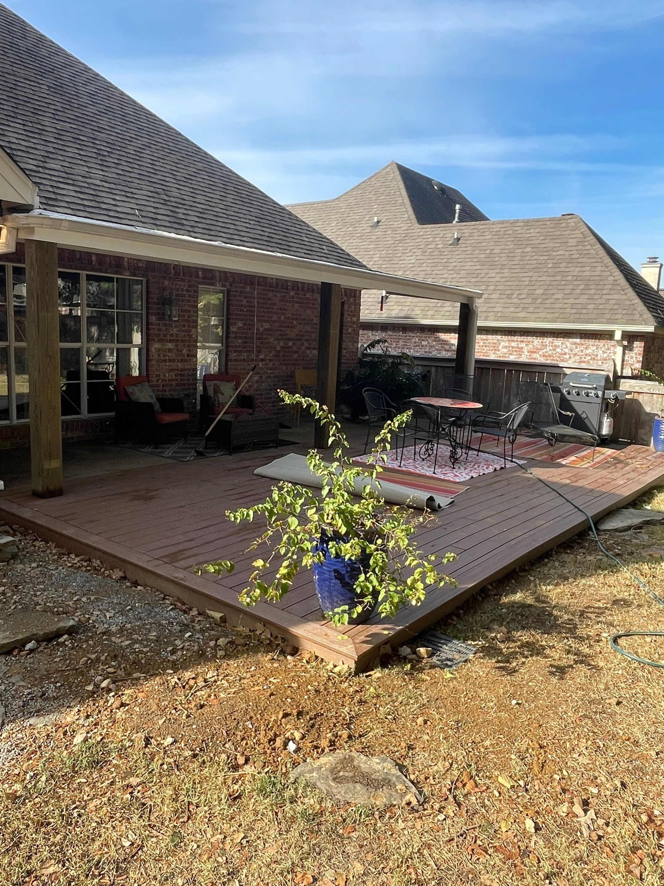 For this backyard transformation, we removed an old concrete slab and a small treated wood deck and replaced them with a **spacious, all-composite deck** in the **Canoe** color. This low-maintenance upgrade provides a sleek, modern look while offering superior durability and resistance to weathering. With a smooth, open design, this deck creates a seamless transition between the indoor and outdoor living spaces.