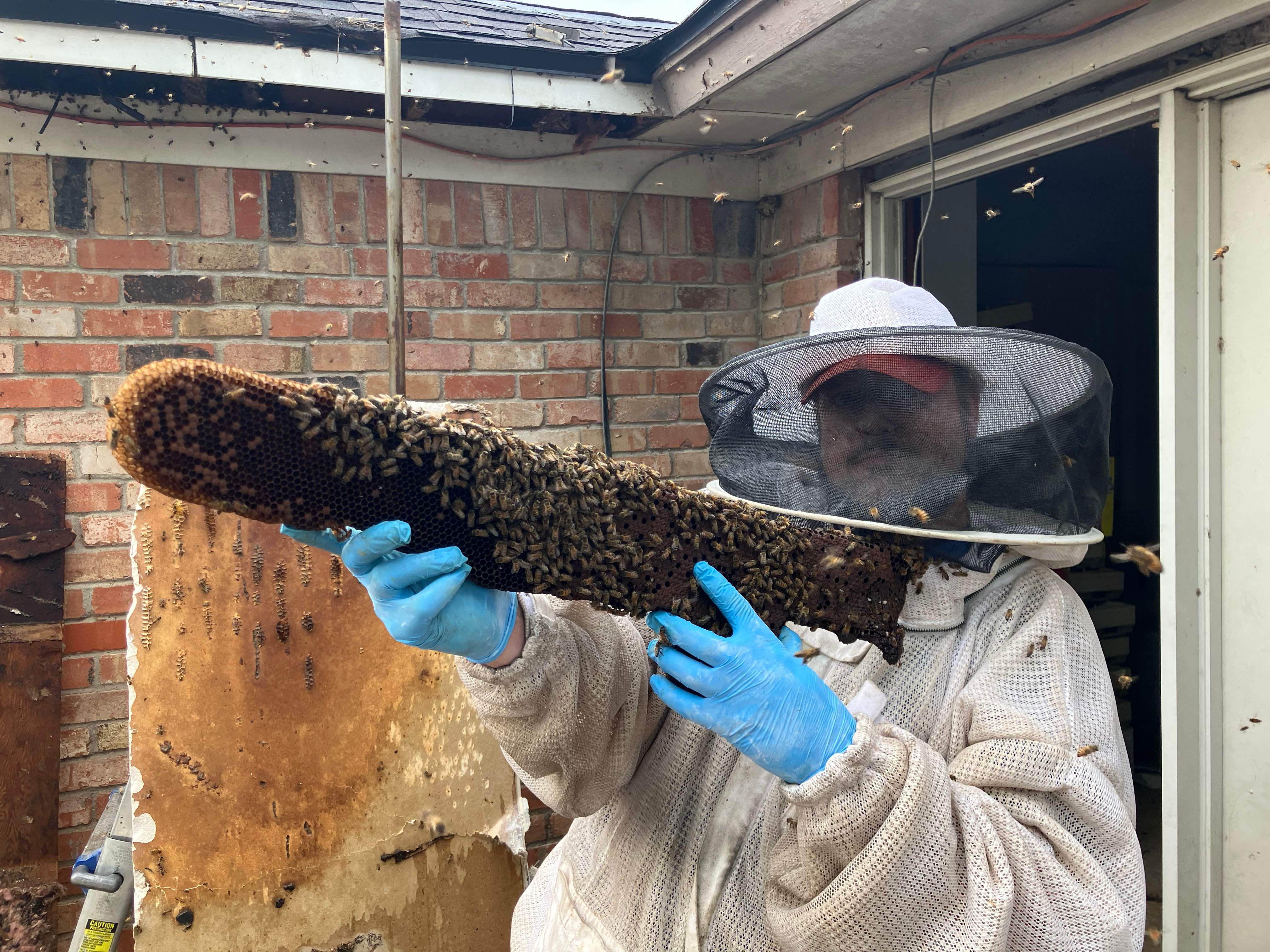 This home owner had bees move into a wall that was repaired after water damage, but the contractor did not replace the insulation. So the bees moved into the cavity (which should never have been left open to begin with).