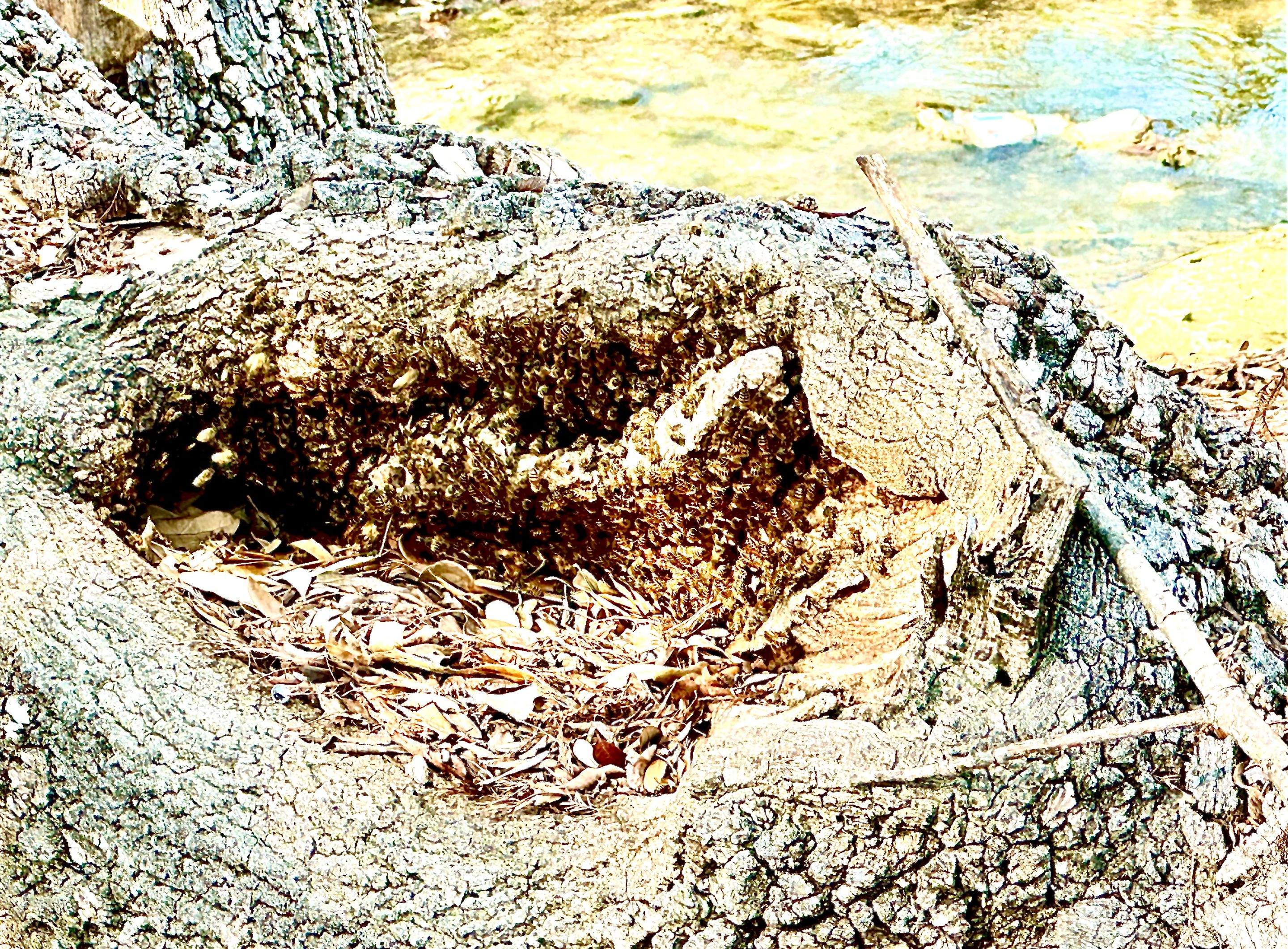 This tree fell in a greenspace between commercial buildings and made lunchtime walkers nervous. We cut the tree trunk down to a movable size and carried the bees away. if we cut excess wood away until we reach the outside of the nesting cavity there is not as much weight left to manhandle- its mostly then just empty tree space filled with comb (though of course there's often 50+ pounds of honey and wax and a few more pounds of bees to contend with). This one took a lot of grunts and many sore muscles to move.