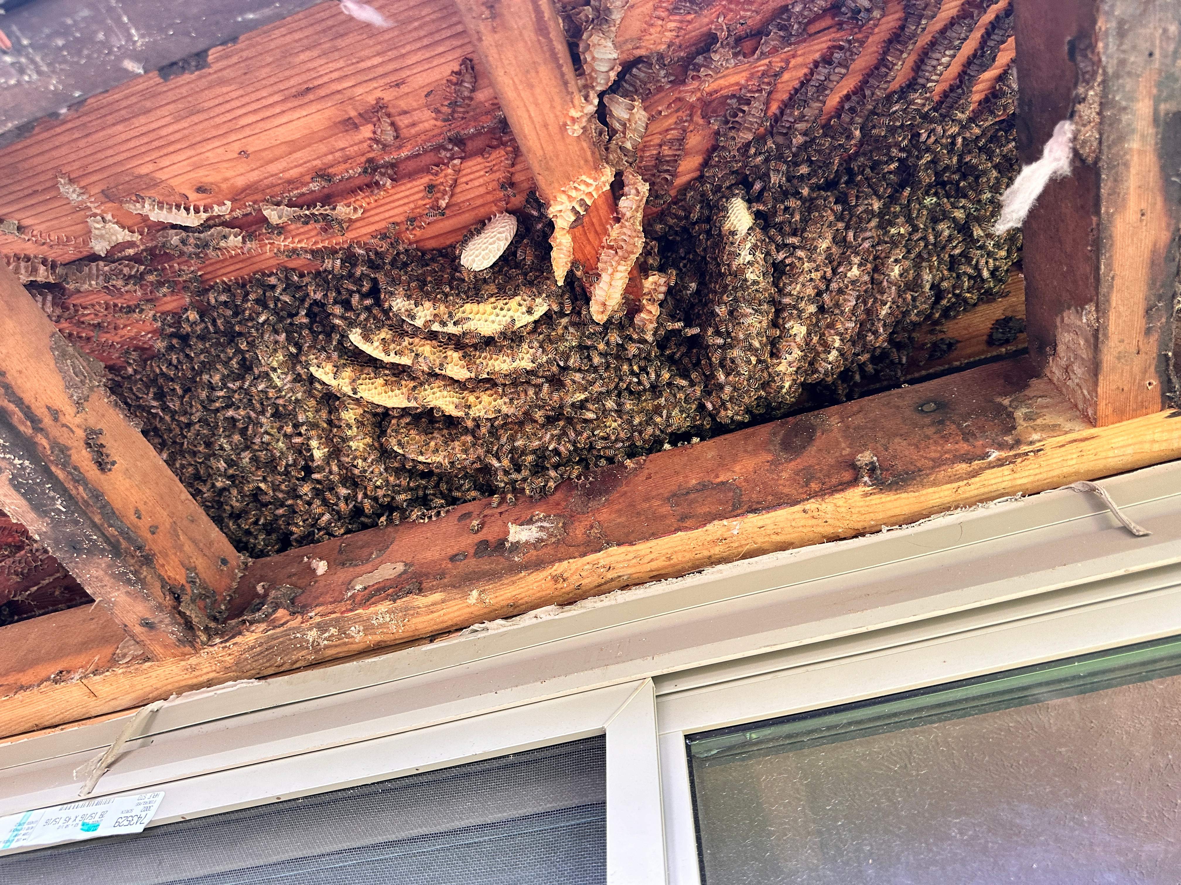 The home owner didn't make sure his contractor stuffed the cleared cavity two years previous when bees were relocated from this space. Only one simple layer of fiberglass was laid down so the bees nested above it. No bueno! The cavity has to be STUFFED to prevent future bee move-ins!