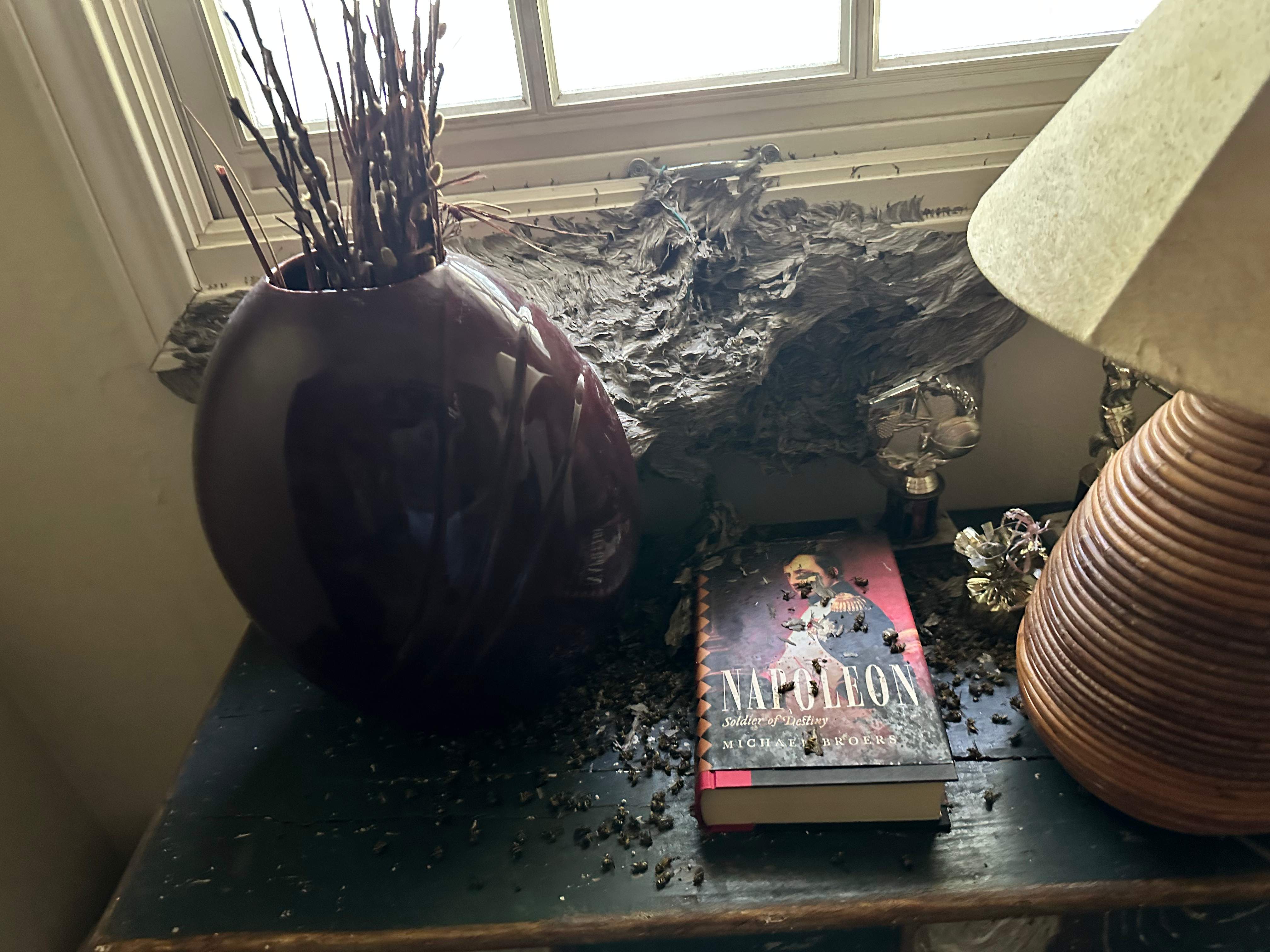Yellowjackets nested in the wall and grew a HUGE nest into the bedroom! Home owner had been battling them for months, spraying poison across the room and just couldn't get rid of them.. yellowjackets at this time of Fall produce DOZENS of new queens- and yes, they sting THROUGH our bee gear, but removed them all WITHOUT poison!