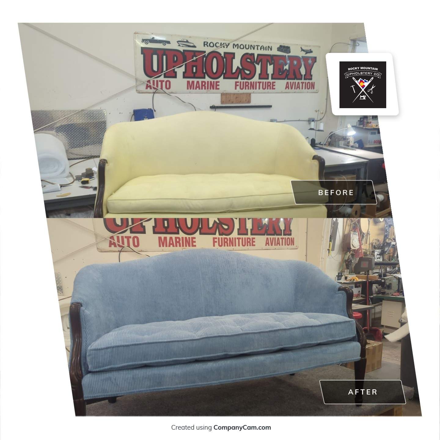 Antique Settee reupholstered in a Charlotte fabrics baby blue large corduroy microfiber.
