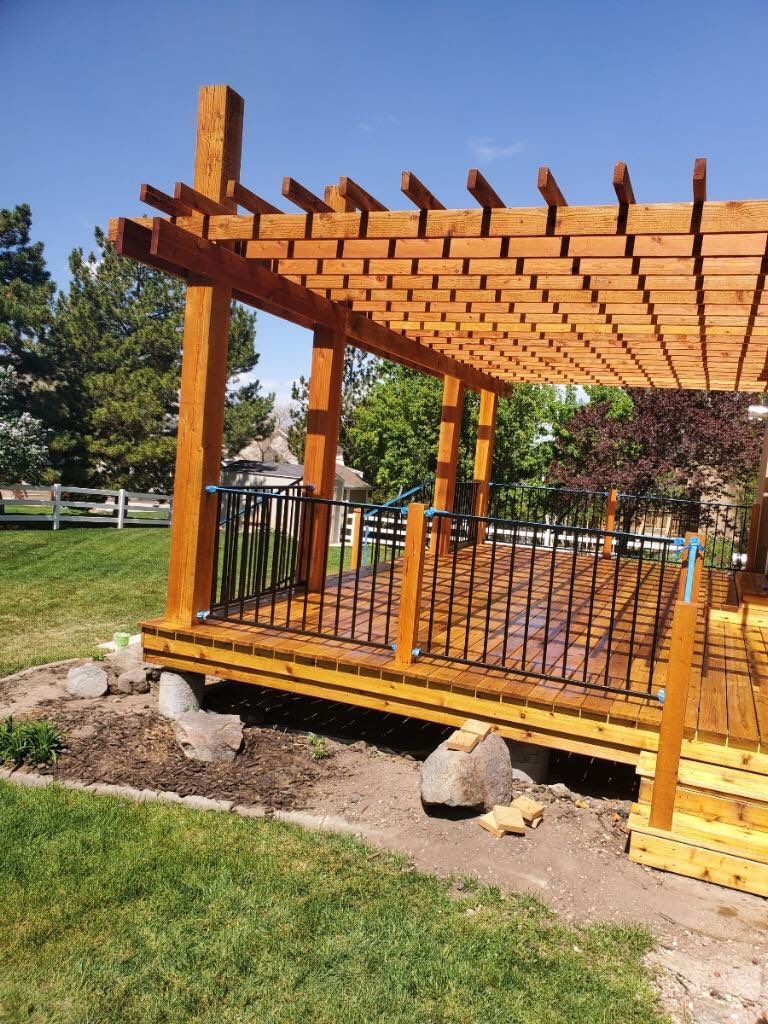 Remodeled deck with rough sawn timber and cedar decking. Iron black railing.