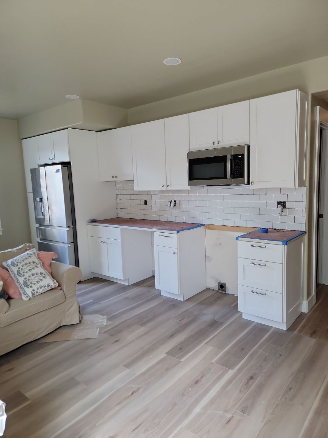 Added a full kitchen and bathroom to an unfinished basement. Created separate entrance to the basement. Added laundry room. Installed sound deadening insulation into the ceiling of the bedrooms.