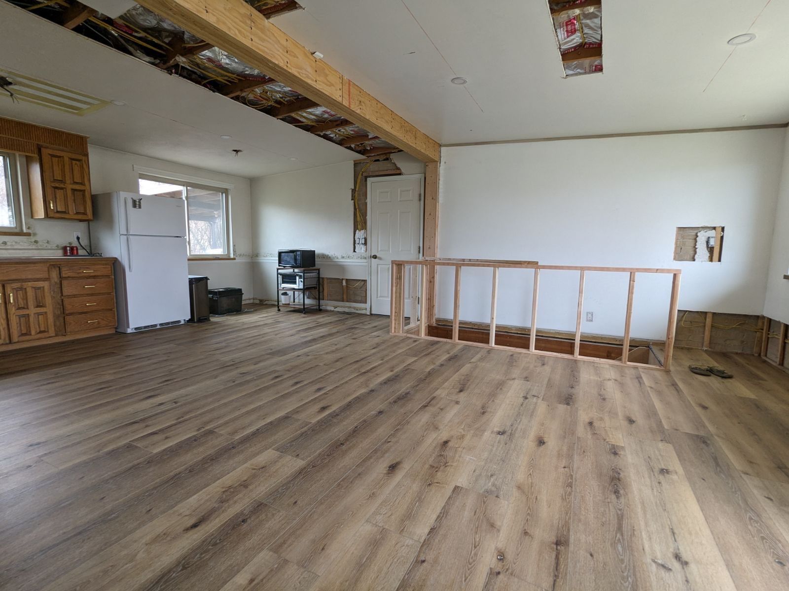 Removed center wall to create open floor plan. Relocated stairs that were located in the center of the room.