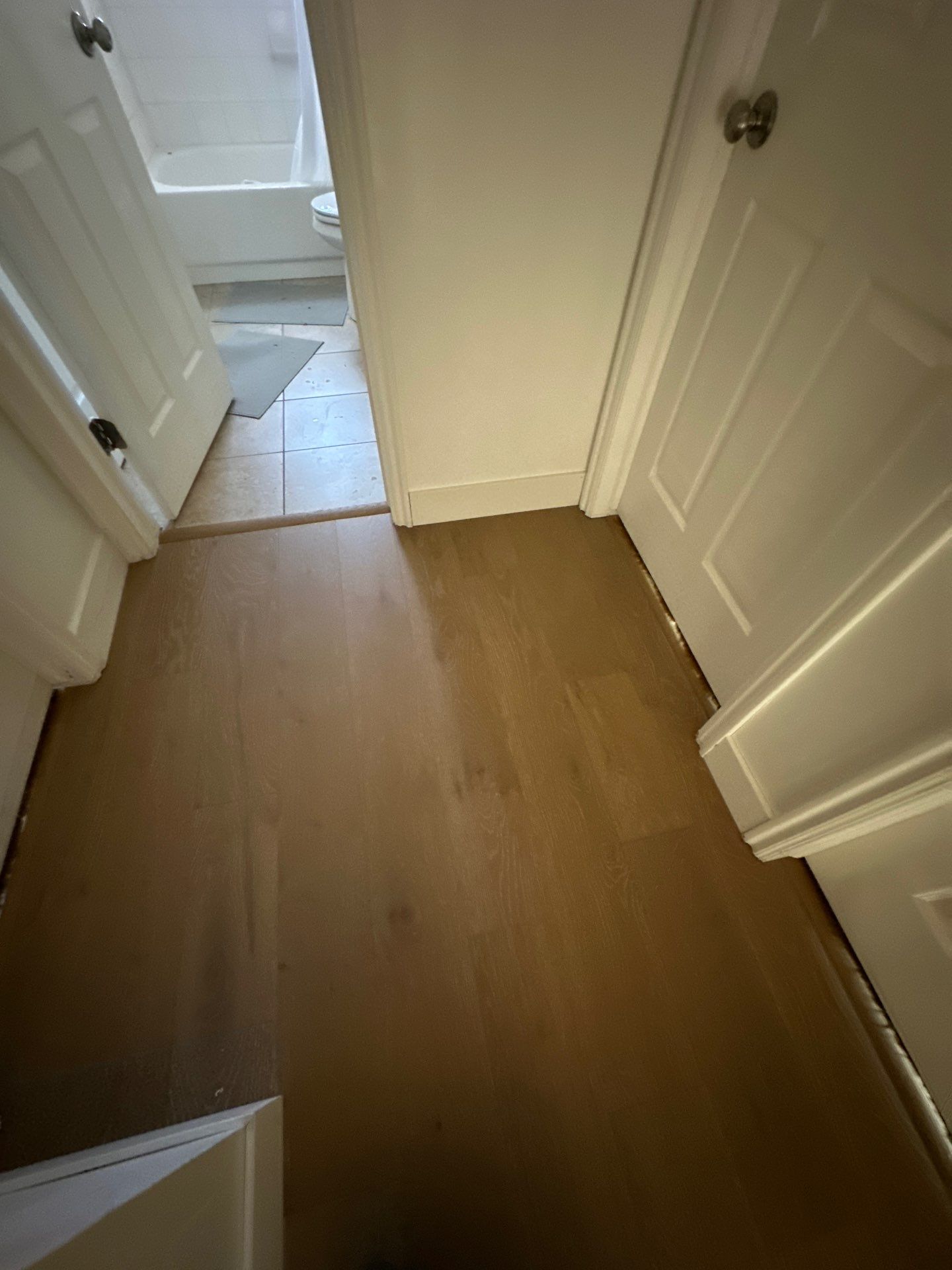 Removed existing laminate and installed oak flooring throughout the main floor. Removed wall in family room and add lighting in kitchen and family room.