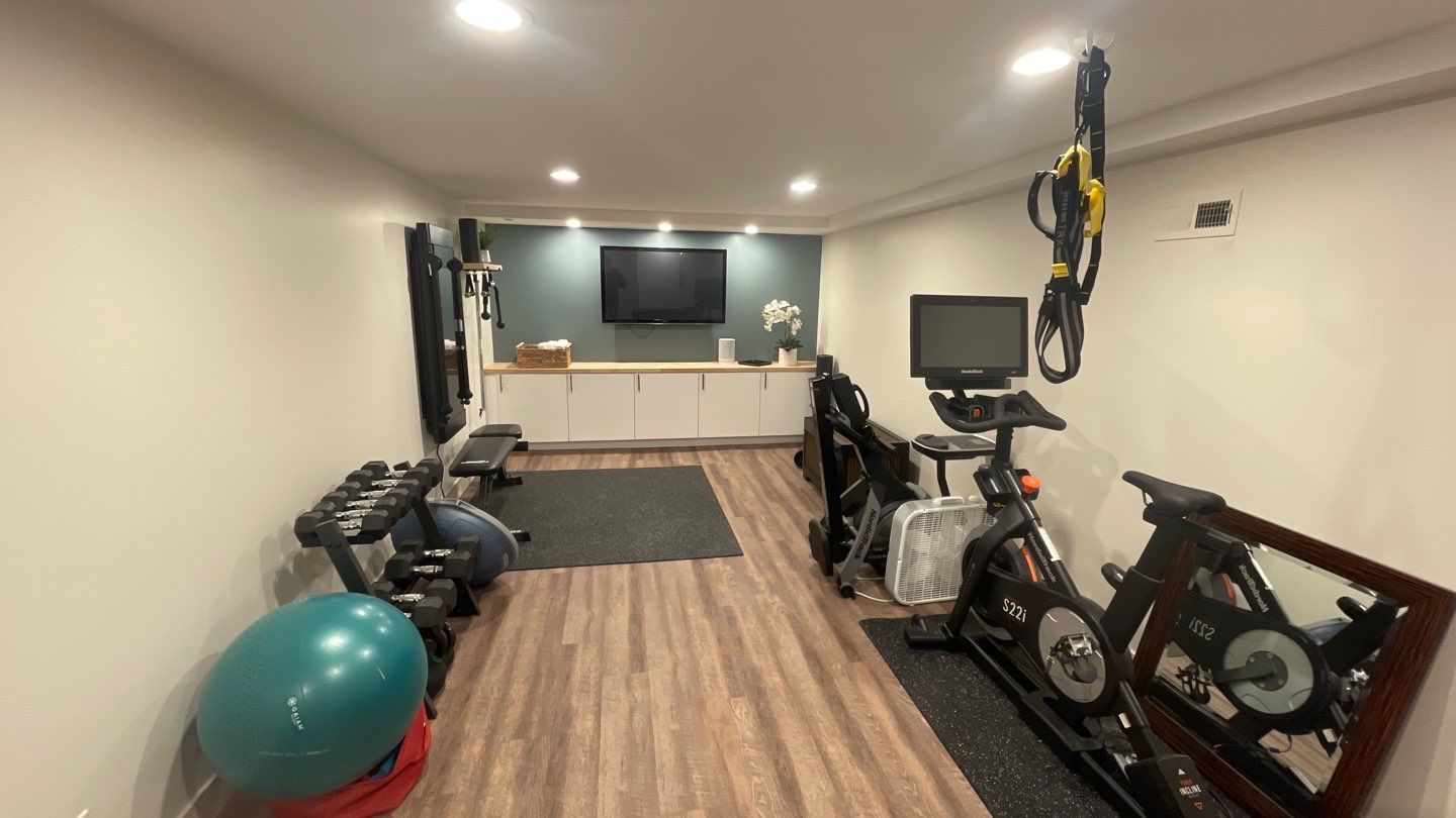 Basement remodel. All new flooring and trim. Removed a fireplace and replaced with cabinets and wall mounted TV.