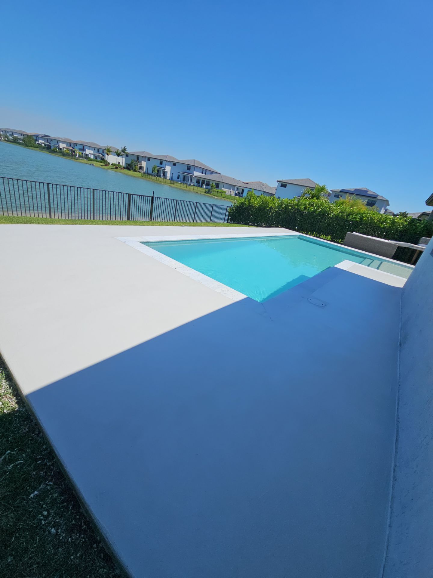 On this pool deck we applied a base coat of spray deck from Surecrete and a top coat of Microtek with integrated Natural White Color.