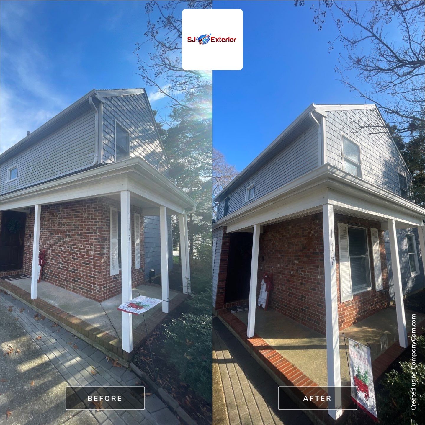 Blow out all debris from gutters and insure downspouts are clear. Then blow the debris that came out of gutters from, walkways, sidewalks, driveways and patios. House Wash is done using a process called softwash. Start by checking house electrical outlets and tape up as necessary as well as door key slots. Pre water with low pressure all plants trees, bushes, flowers and shrubs. Using low pressure apply metered water with SH (sodium hypochlorite) and surfactant is optional. Allow to dwell average time is 15-20 minutes, water plants while waiting. Then after dwell time using low pressure rinse all surfaces.