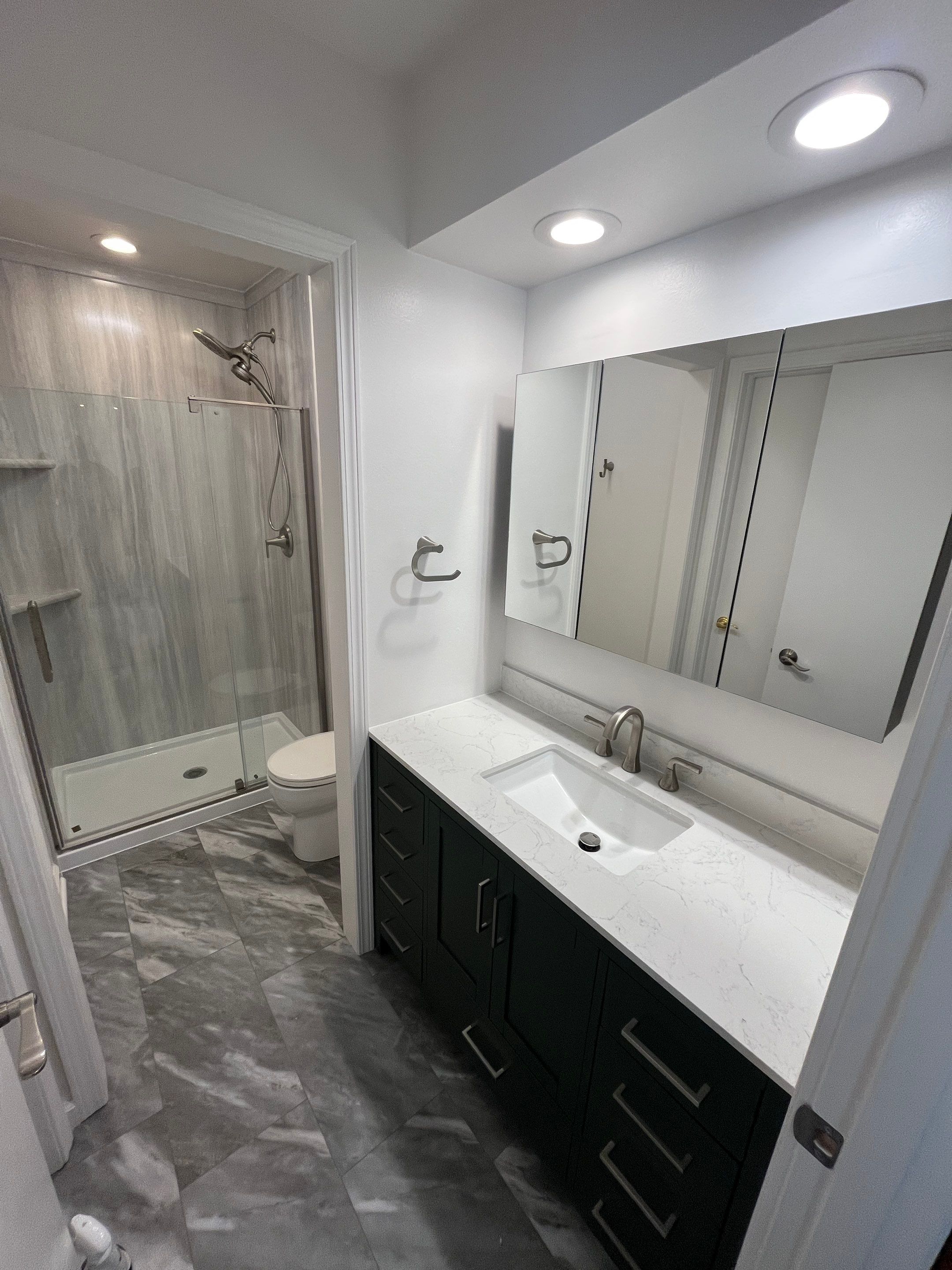 This Wheaton bathroom was in desperate need of attention. Our team completed this Snap Bath in just 4 days. New shower, toilet, floor, vanity and paint.