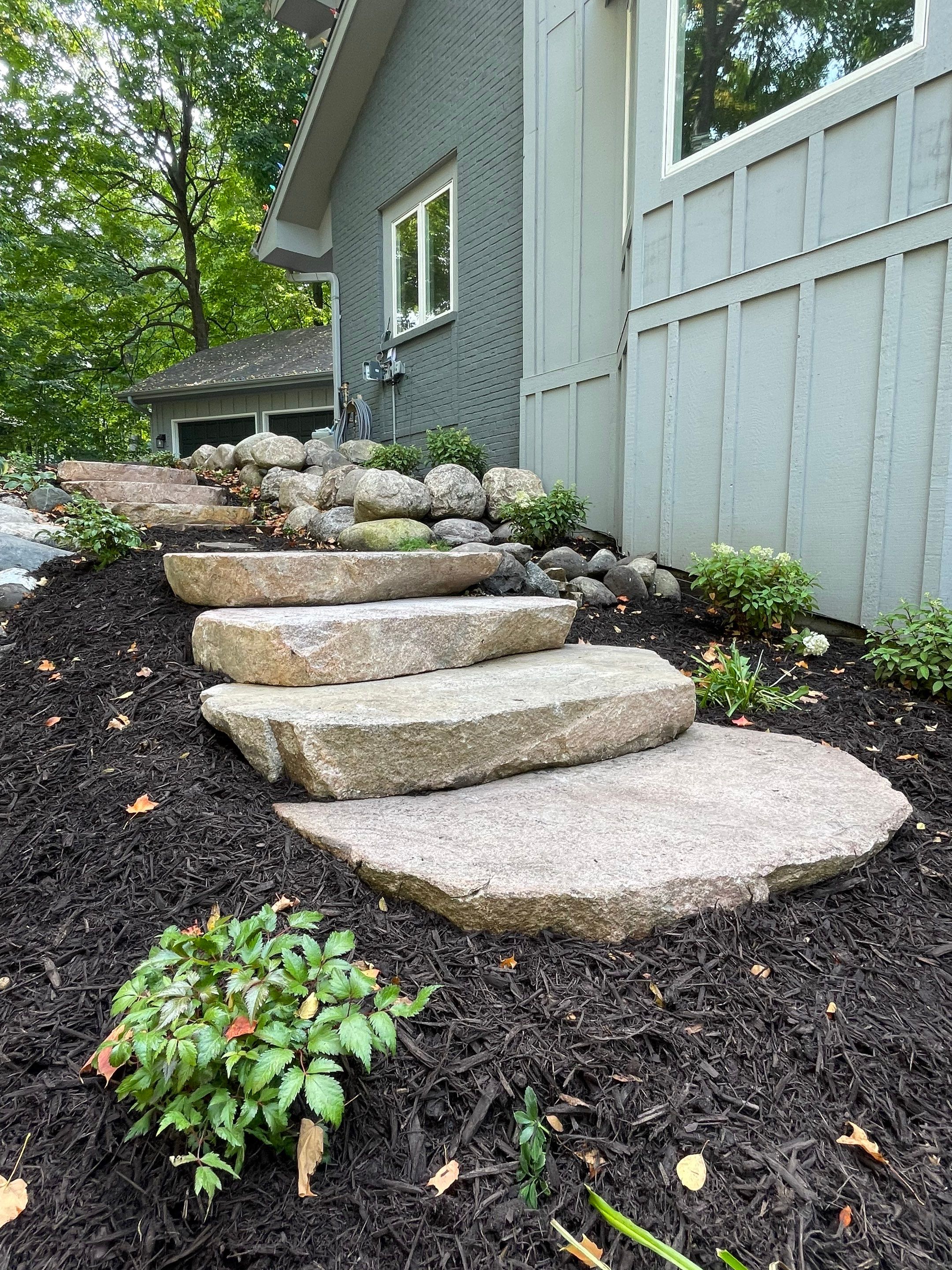 Sota landscapingThis customer came to us wanting to redo his entire side yard on a wooded lot in Minnetonka. We had our designed mock up an entire plan, which was accepted by the client, and got to work. We tore 90% of it out, graded the entire yard, installed new perennials/trees/shrubs in all the beds, installed 4 boulder steps to match what was currently there, irrigation system in all lawn areas, and new hydroseed throughout.