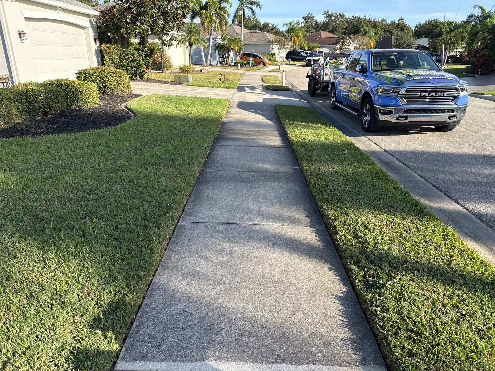 Sunshine AquaWash completed a full concrete cleaning project in the Northwood Park Community of Palmetto, FL. We pressure washed the concrete driveway, entryway, sidewalks, and street curbing — all of which had noticeable algae and dirt buildup from Florida’s humidity. Our process included a thorough surface cleaner wash followed by a detailed rinse, restoring the concrete to a bright, clean finish that instantly boosted the home’s curb appeal. If your driveway or sidewalks are looking dark, slippery, or weathered, Sunshine AquaWash can bring them back to life with professional, veteran-owned service you can trust. https://www.sunshineaquawash.com/residential-pressure-washing-services/drivewaycleaning