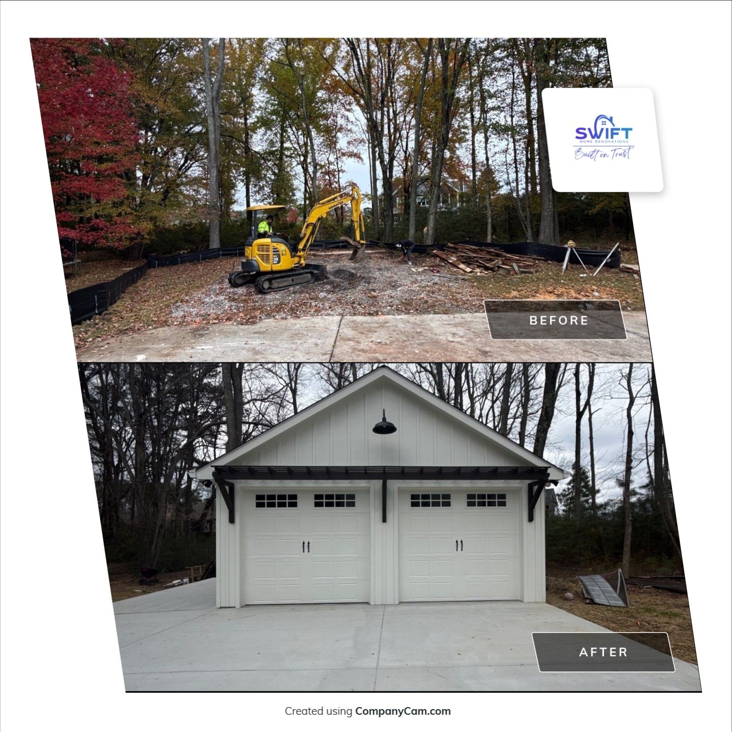 Site preparation and excavation followed by construction of a new two-car detached garage. Work included foundation preparation, concrete slab installation, full framing, siding installation, roofing, and installation of two overhead garage doors. The project was completed with exterior trim, decorative brackets, lighting, and a new concrete driveway approach to provide a durable and functional standalone garage structure that complements the property.