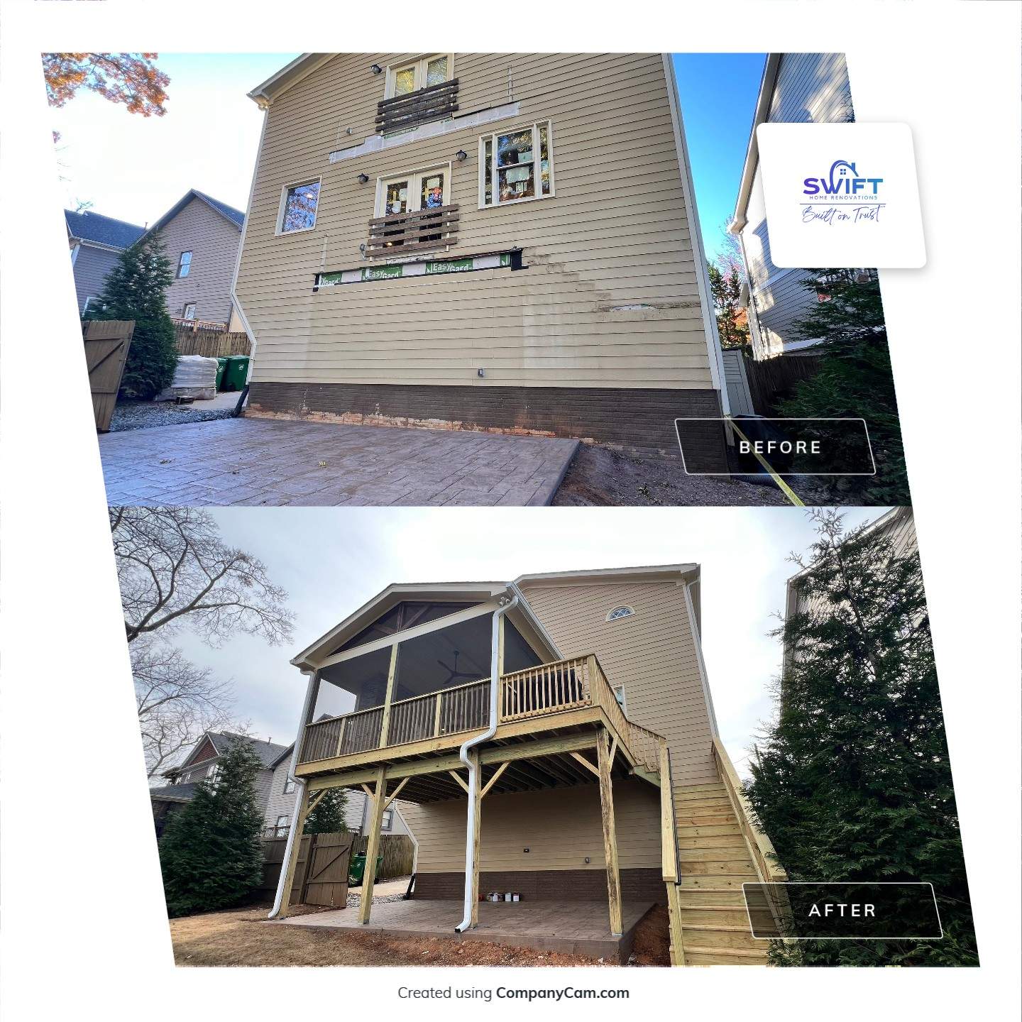 Complete transformation of the rear exterior into a functional outdoor living space. This project included building a raised deck with structural framing, a covered roof, and a screened-in enclosure for year-round comfort. A custom fireplace was added as the focal point, along with new stairs, railings, and electrical features such as lighting and a ceiling fan. Finished to match the home, this space adds both value and everyday usability.