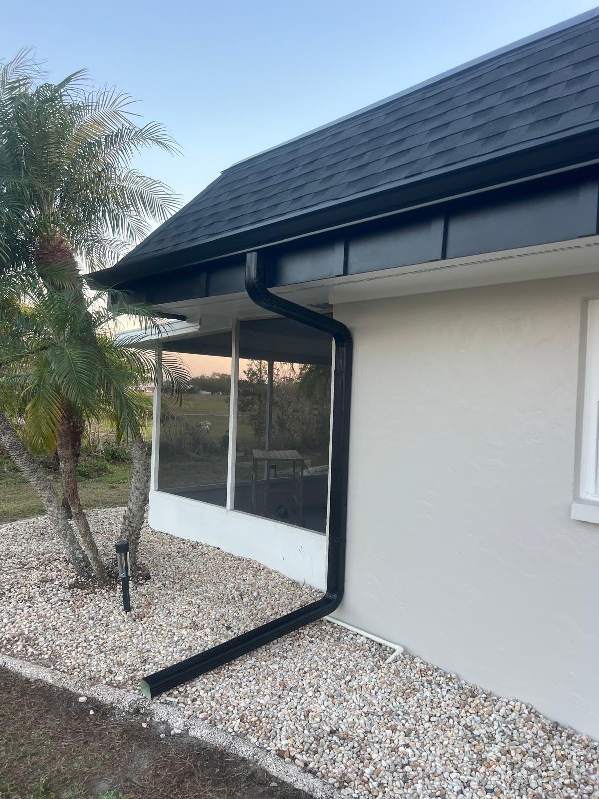 Professional installation of black 6-inch K-style seamless gutters with matching black downspouts in Sun City Center, FL, designed to provide high-capacity rainwater management and a modern, cohesive exterior appearance. The seamless gutter system was custom fabricated on-site to ensure an exact fit along the roofline, reducing joints and minimizing the risk of leaks. The 6-inch K-style gutters offer increased water capacity, making them ideal for handling Florida’s heavy rainfall and preventing overflow during storms. Their structural design provides durability while maintaining a clean, architectural look that complements a wide range of home styles. The black finish adds a bold, contemporary contrast that enhances curb appeal and blends well with roofing and trim elements. Matching black downspouts were strategically installed to efficiently channel water from the gutters to ground level and safely away from the foundation. High-quality aluminum materials were used throughout the system to ensure resistance to rust, corrosion, and harsh weather conditions such as humidity, UV exposure, and coastal air. This complete gutter and downspout installation improves drainage performance, protects the roof, siding, and foundation from water damage, and delivers a durable, low-maintenance solution tailored for Florida homes.