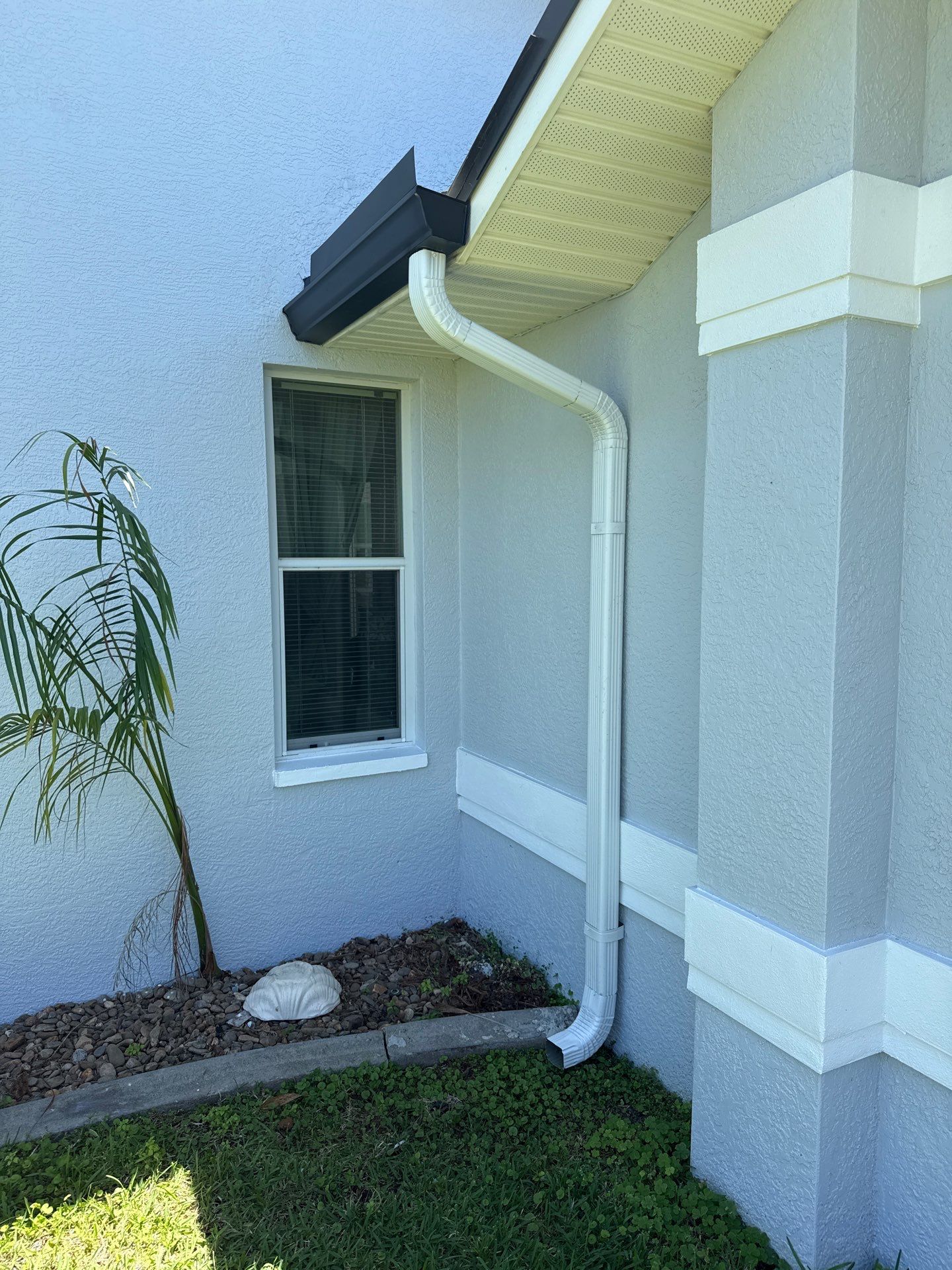 Professional installation of black seamless gutters with white downspouts in Cape Coral, FL, designed to provide efficient rainwater management while creating a clean, high-contrast exterior look. The seamless gutter system was custom fabricated on-site to ensure a precise fit along the roofline, minimizing joints and reducing the risk of leaks. The black gutters deliver a modern, bold appearance that complements the roofline, while the white downspouts provide a crisp contrast that blends with the home’s trim. This combination enhances curb appeal while maintaining functionality. High-quality aluminum materials were used to ensure durability and resistance to rust, corrosion, and Florida’s harsh coastal conditions. The downspouts were strategically placed to direct water safely away from the foundation, helping prevent erosion, water intrusion, and structural damage. This installation improves overall drainage performance, reduces maintenance needs, and provides a long-lasting, visually appealing solution tailored for homes in Cape Coral.