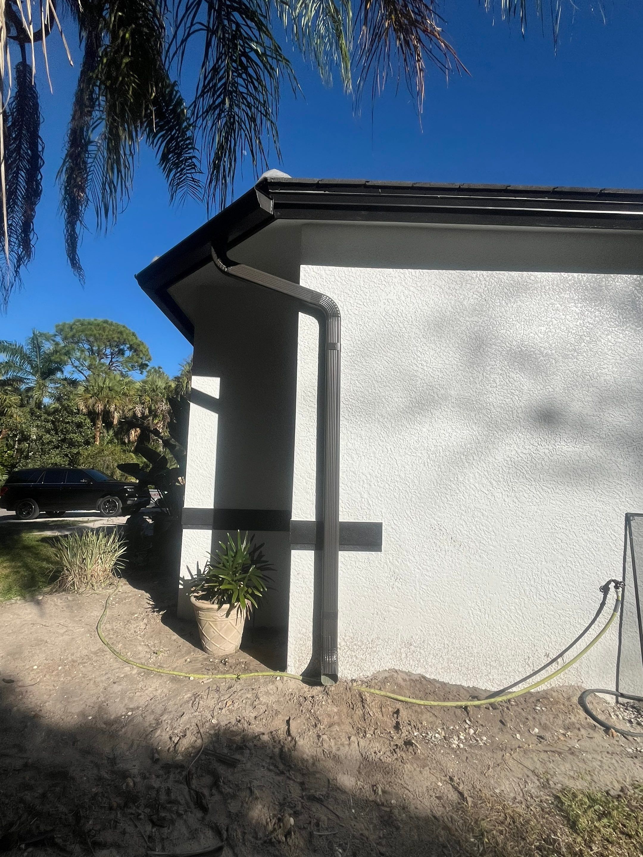 Dark Bronze seamless gutter installation completed in Naples, FL using matching bronze gutters, downspouts, and splash guards. The new system improves rainwater flow, directs water safely away from the home, and adds a durable, upscale finish that enhances curb appeal and protects the foundation.