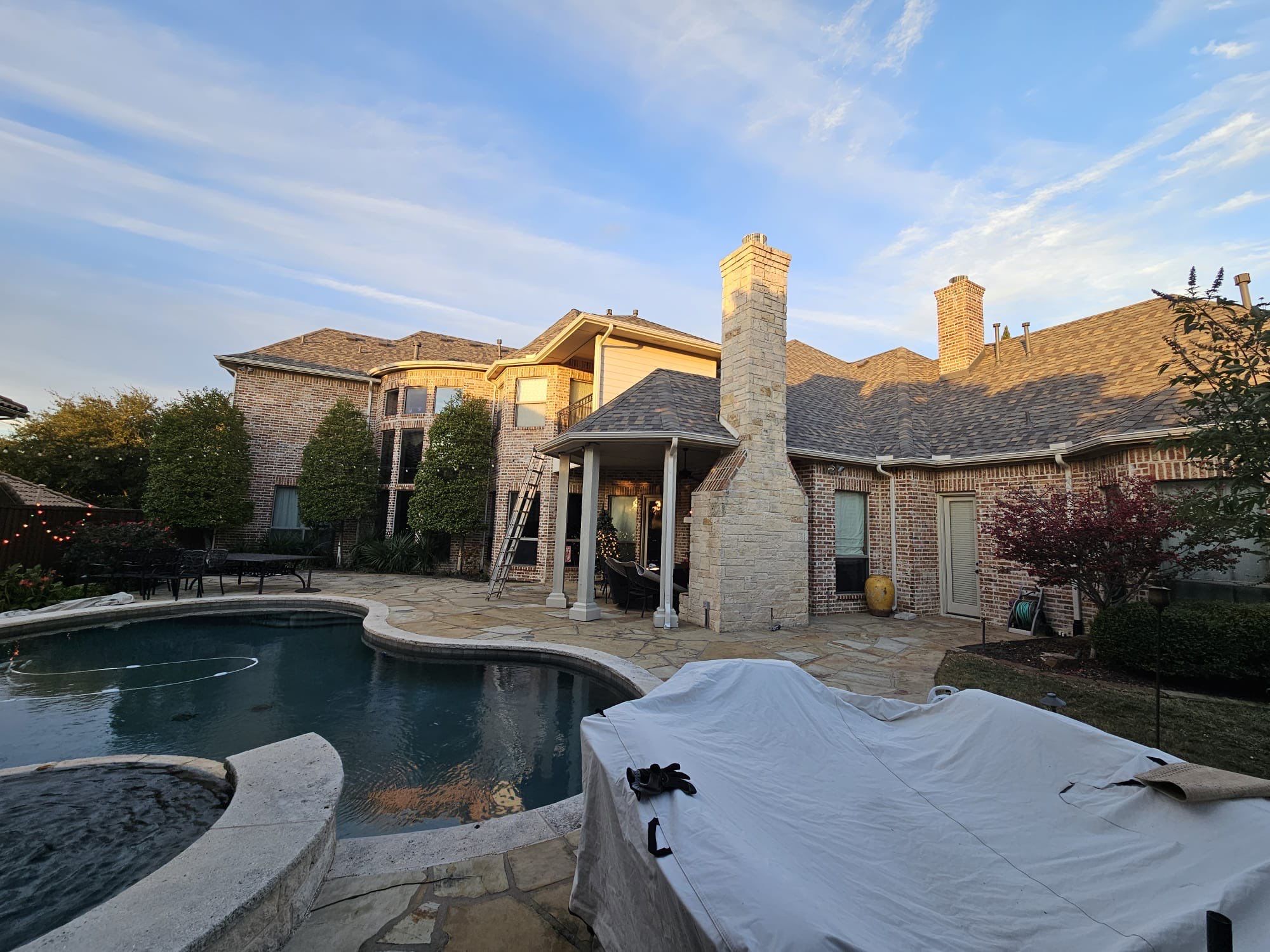Light red brick/cream stone/espresso shutters with IKO Cornerstone