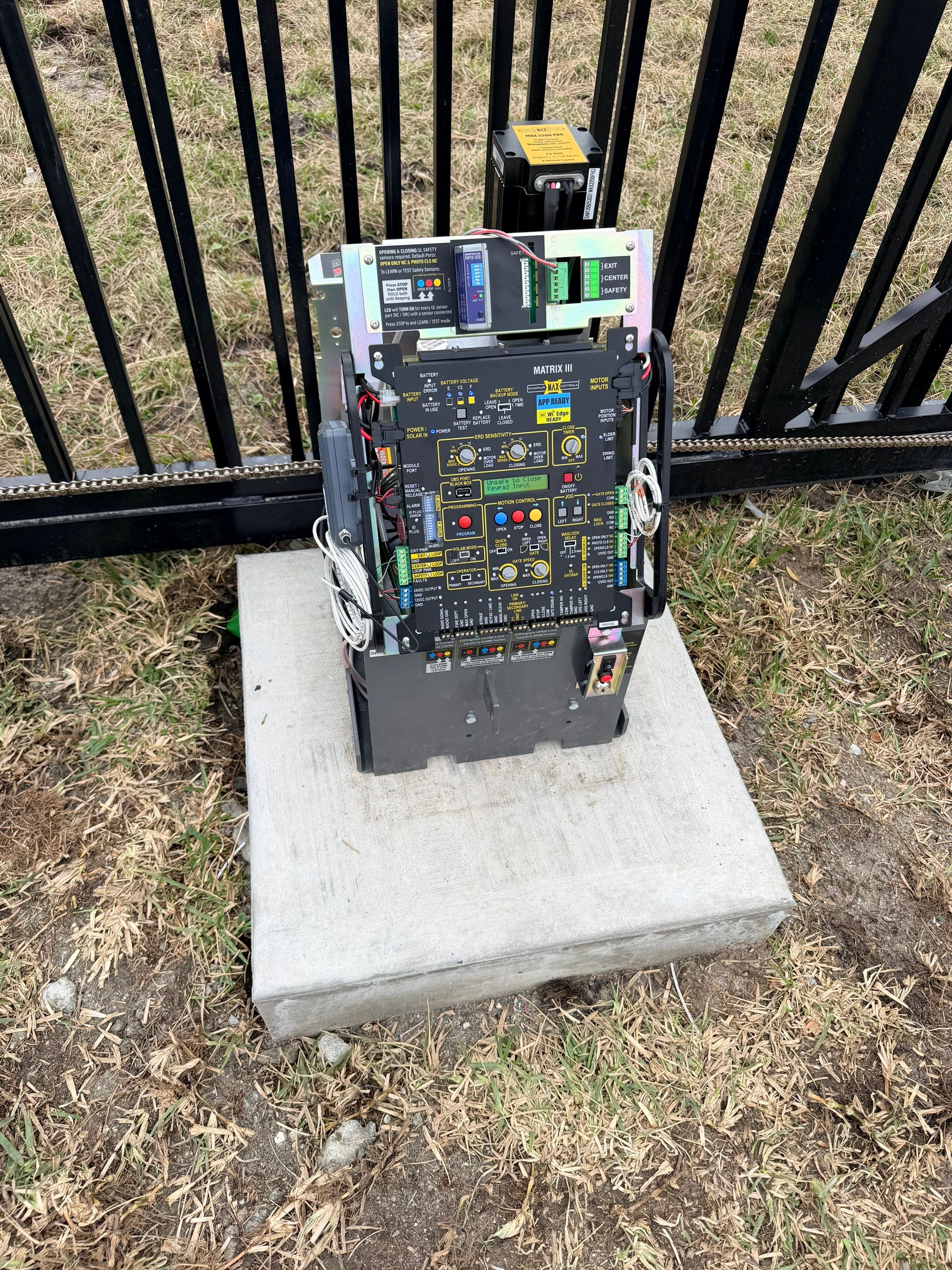 Commercial slide gate operator installation in Melbourne, FL featuring a MAX control board mounted on a concrete pad for a secure and weatherproof setup. TeleCommPro handled full low-voltage wiring, control board programming, and system configuration including safety inputs, loop detectors, and entry/exit logic. The MAX control board provides flexible access control integration, allowing the gate to interface with keypads, card readers, and intercom systems. Serving HOA communities, commercial properties, and industrial facilities across Brevard County, FL.