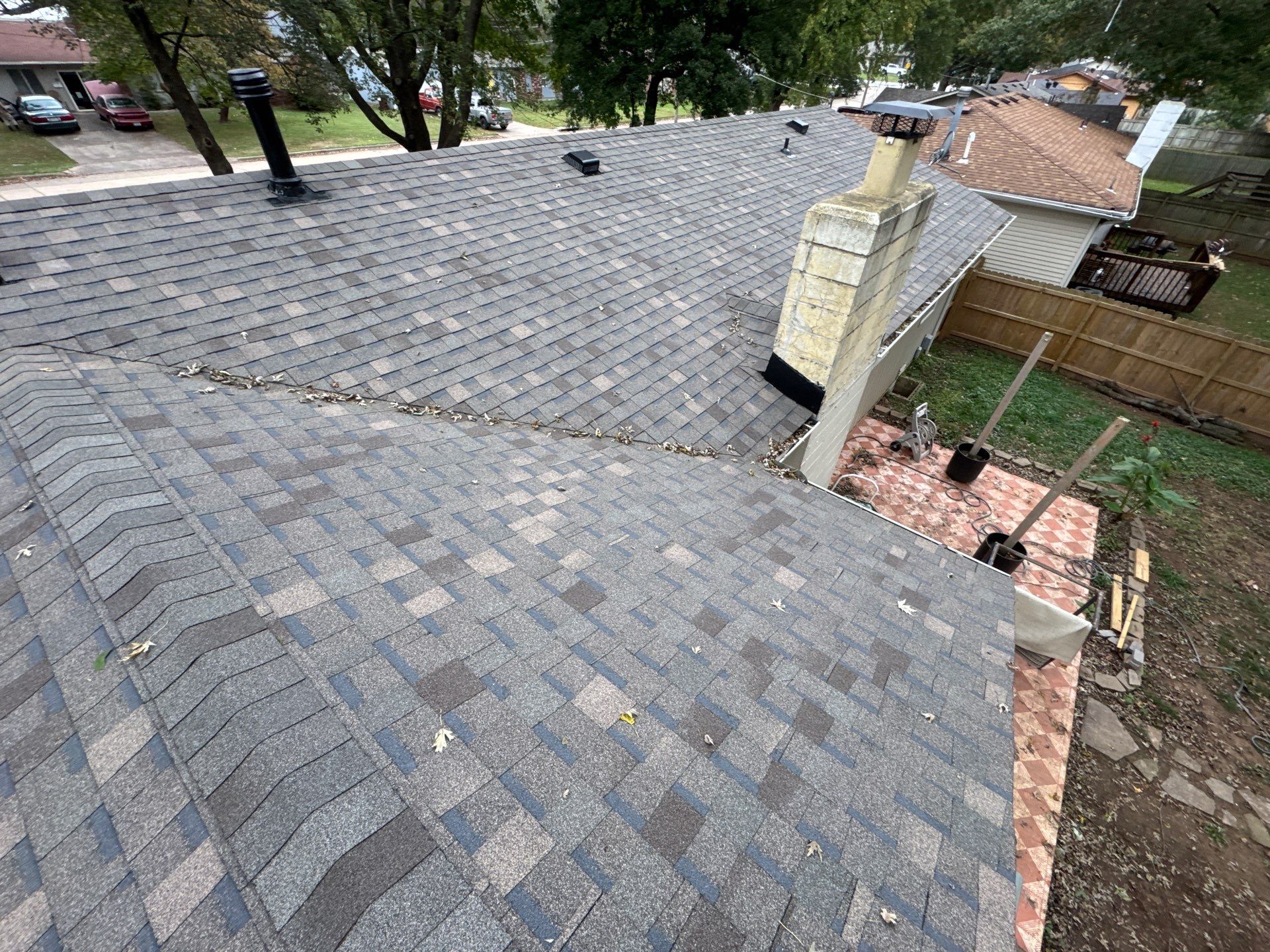 Residential roof & gutters replacement on house. Roof replacement only on shed