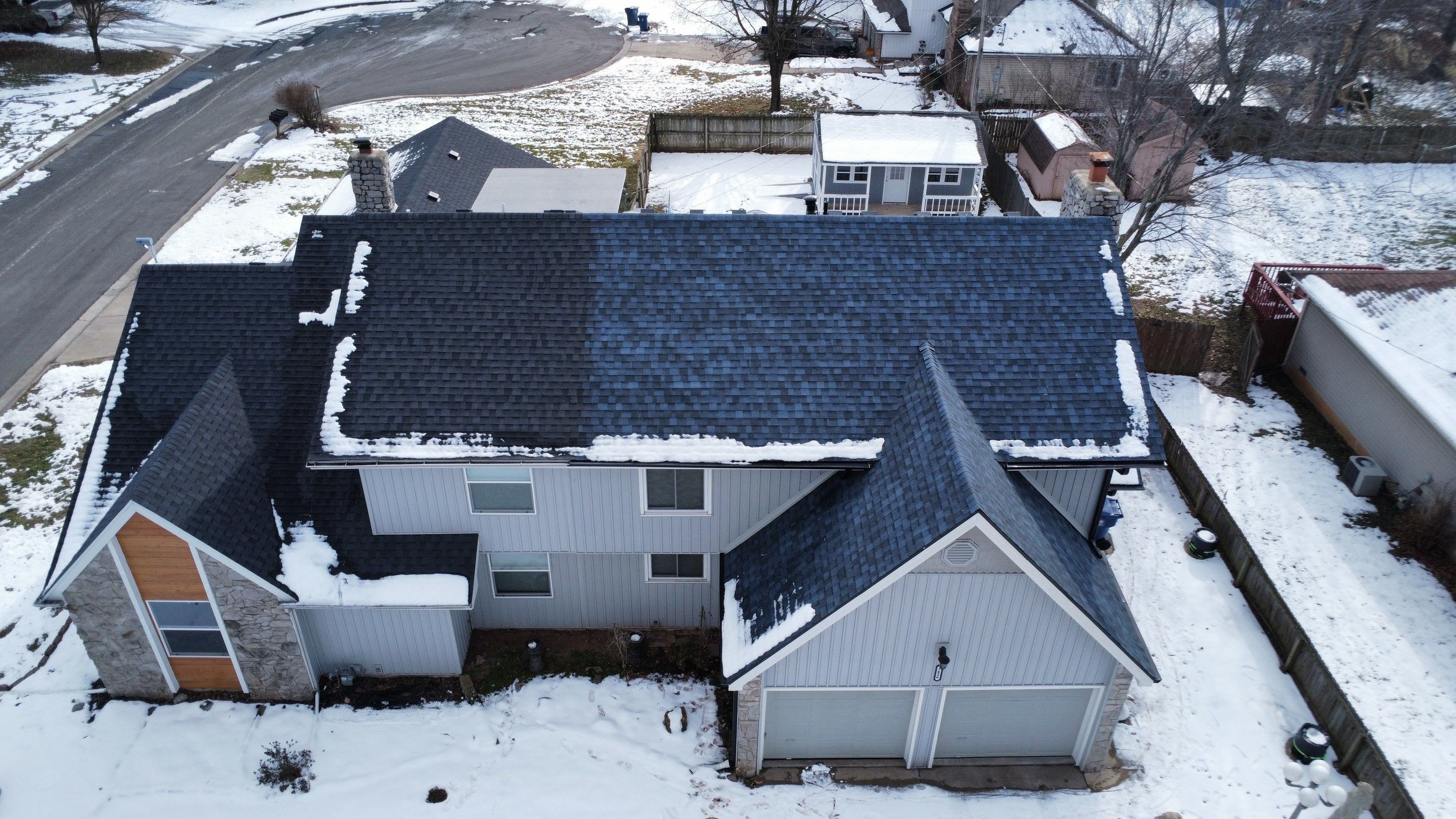 IKO Dynasty Shingle - Color Atlantic Blue, 5" Seamless Aluminum Gutters & 3"x4" Aluminum Gutter Downspouts, GutterLock Diamond Gutter Covers, Residential Gutter Project, Residential Roofing Installation