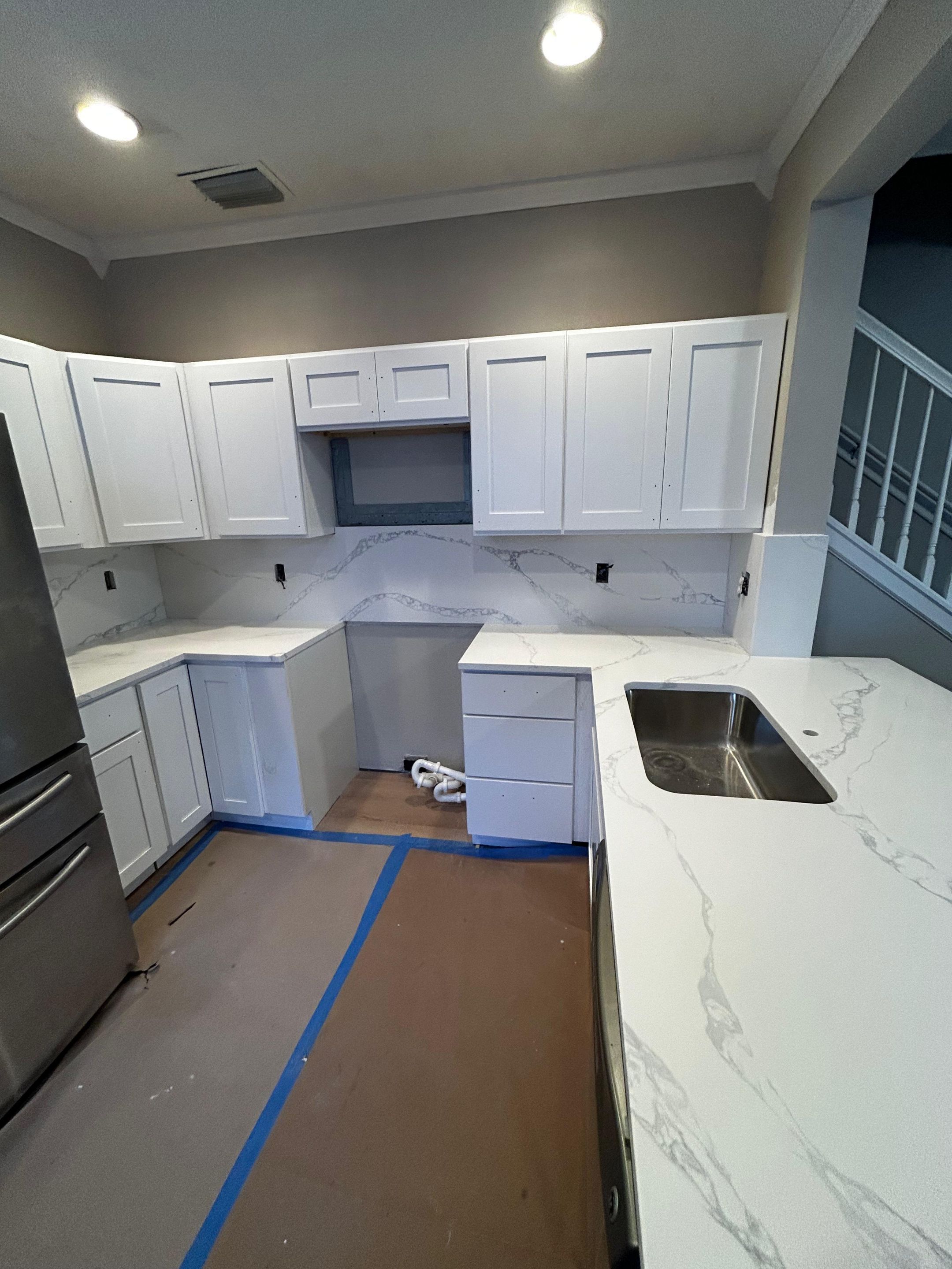 New counter tops and cabinets replacement, lighting, plumbing fixtures, backsplash and molding. New sink and faucet.