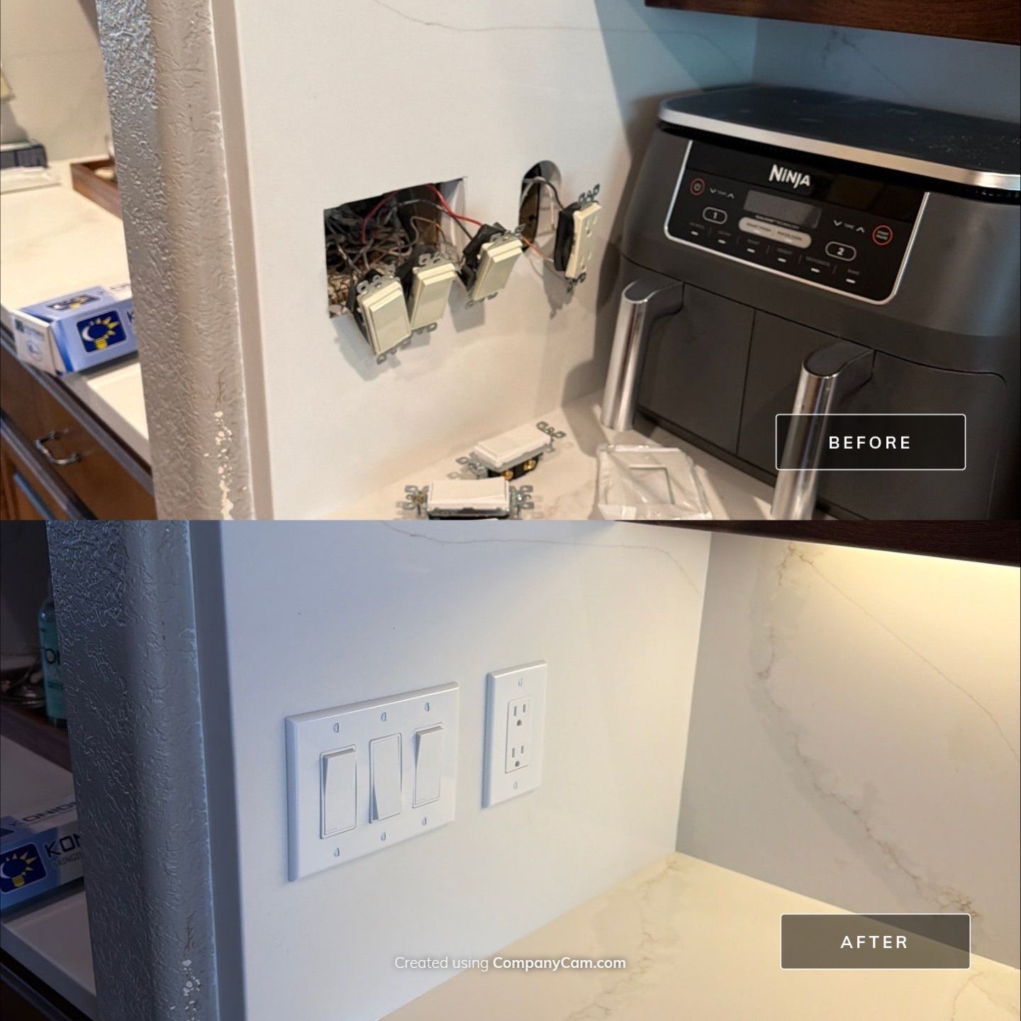 Remove existing light almond devices and replace with new white devices for new stone countertops