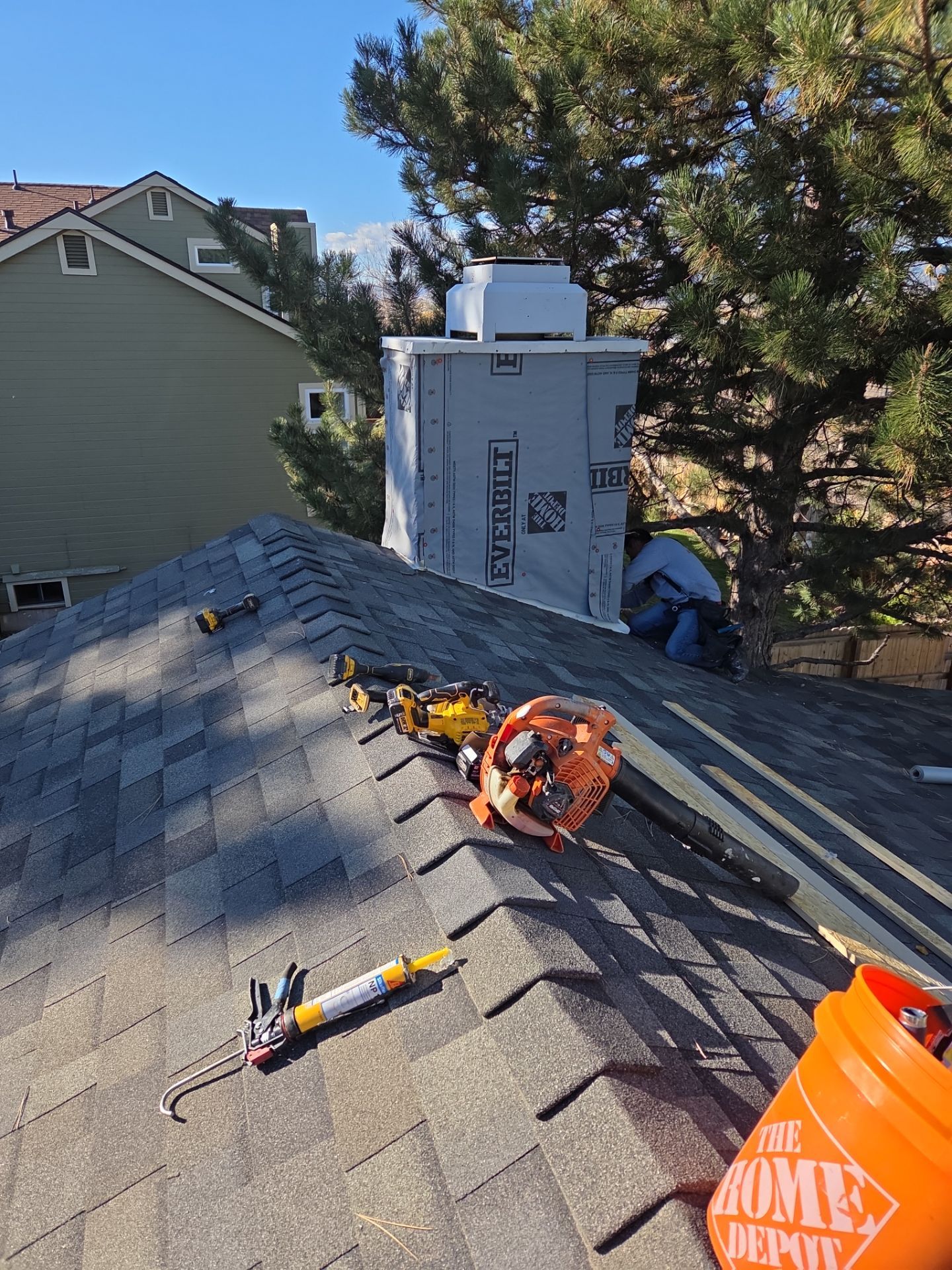 Removed the old siding and 1x4 trim on 3-sides of the chimney. Installed new synthetic house wrap on 3-sides. Installed New 12" LP Smartside Lap siding.
