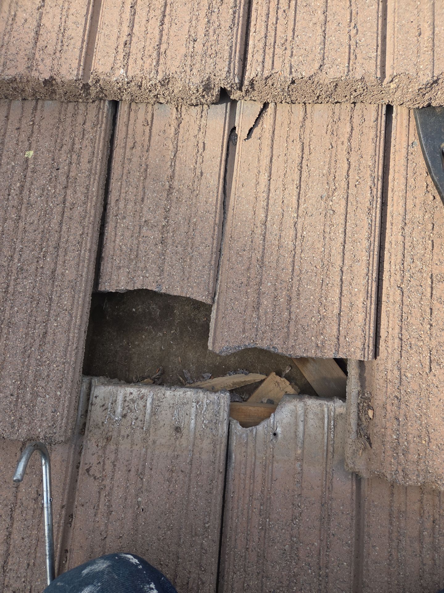 Replaced 3-5 broken tiles. Caulk and seal around roof penetrations. Pick-up the existing tile around the upper front dead valley. Install a New SA Modified Roof System, In the dead valley and tie into the existing pitch roof. Install new gravel stop rake flashing along the short rake edge and new elevated battens. Re-Install the existing tile back to code and tie into the existing tile roof.