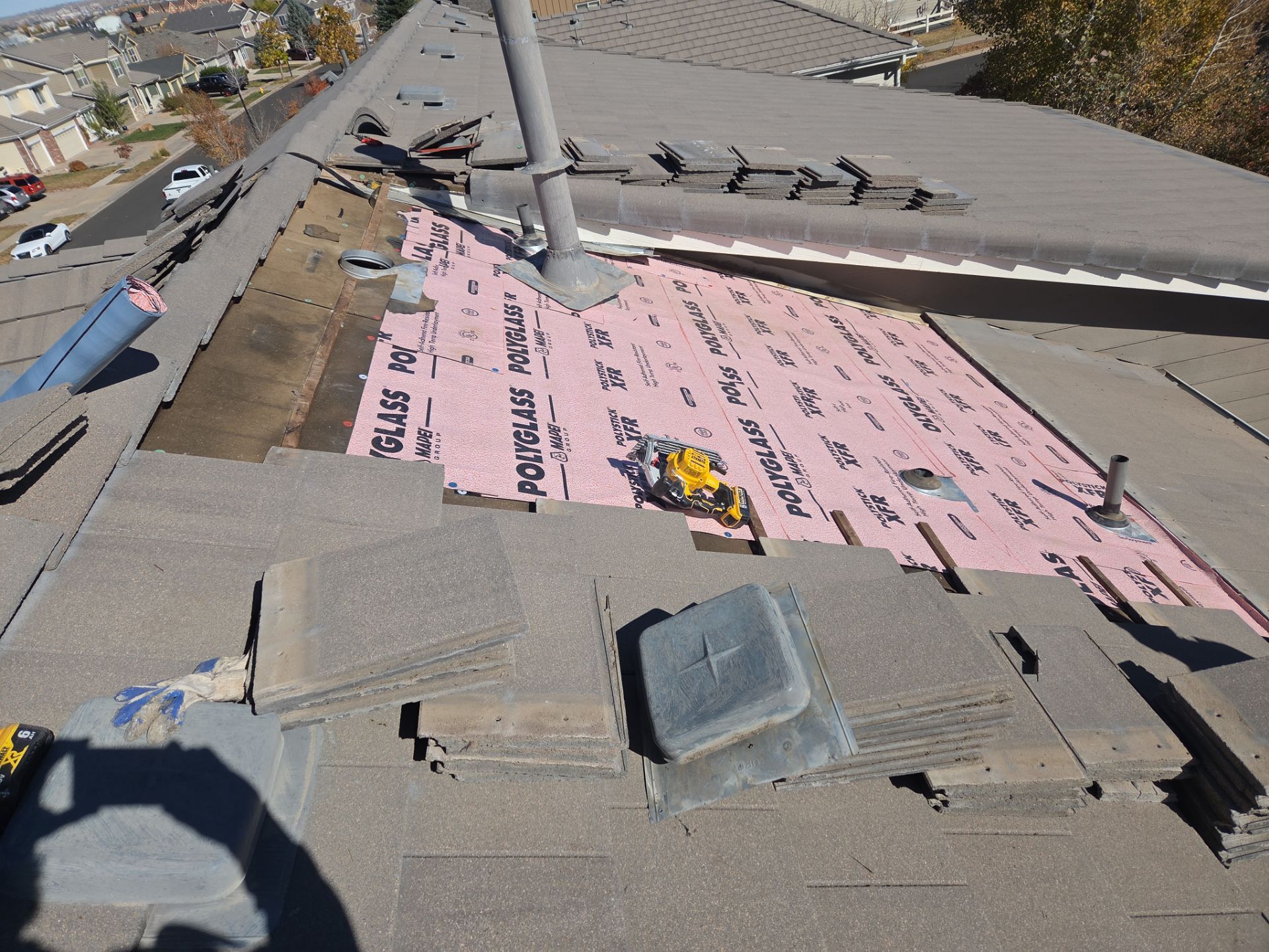 Remove 1sq of tile (10ft x 10ft area). Remove old battens and underlayment. Inspect roof decking for signs of leaking. Install PolyGlass XFR - High Temp / Class A fire Rated - Self Adhering Underlayment. Install New direct to deck 1x2 Batten System. Install Tile Roofing.