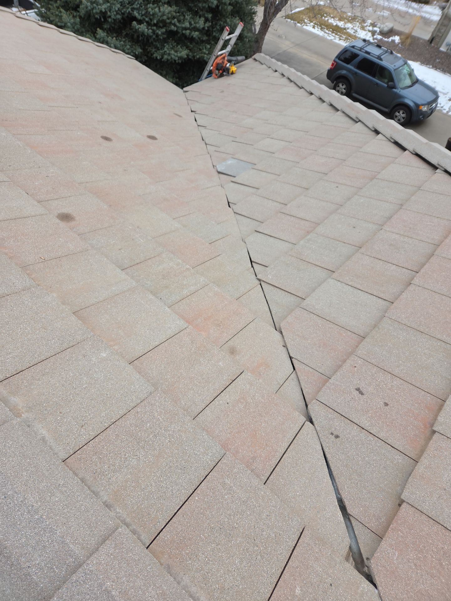 Pick up front valley area stacked and saved tile. Removed all debris out of the valley and removed the cedar battens in the valley. Installed new self-Adhering underlayment and tied into existing underlayment. Repaired two small holes in the existing metal valley. Installed new elevated battens and tie into the existing battens. Re-Installed existing tile back to code and tied into existing roof.